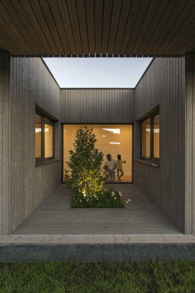 Šiame name įspūdį daro paslėpti garažo vartai, šviesos tuneliai su žaliomis oazėmis, stogo konsolė virš terasos per visą jos ilgį.