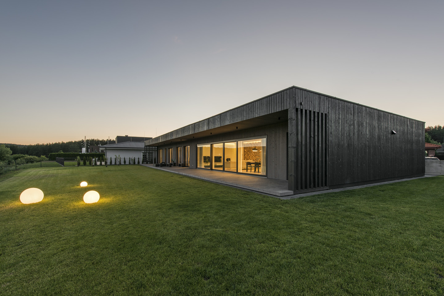 Vėliau suplanuotas dvibutis dviaukštis išsklido į 30 metrų ilgio ir 7 metrų pločio atvirą, kraštovaizdžio nedarkantį namą.
