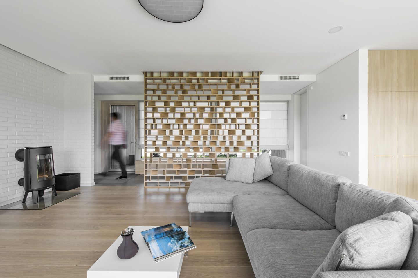 Arba ažūrinė sienelė svetainėje: niekaip nešautų į galvą ją ten projektuoti tam, kad ji saugotų mūsų šeimos privatumą nuo gatvės pusės, į kurią žvelgia didžiuliai langai.“