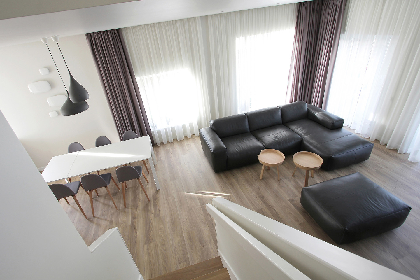 Natūralaus ąžuolo grindų, laiptų, baldų spalva kartu su balkšvomis sienomis ir baltomis durimis interjere kuria erdvumo įspūdį. Fragmentiškai atsirandantys pilki ir juodi atspalviai vizualiai suteikia erdvėms svorio ir įveda tam tikros estetikos bei tvarkos.