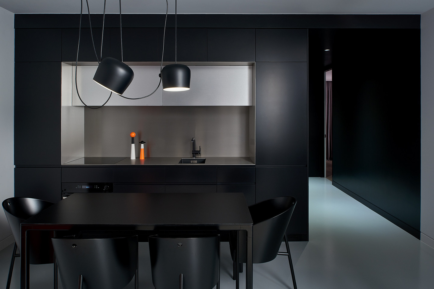 Kauno senamiestyje esančiame bute interjero dizianeriai Normundas Vilkas ir Dovilė Paunksnytė siekė vizualiai padalinti erdvę į bendrą ir poilsio zonas, čia svetainė nuo miegamųjų atskirta juodos spalvos tūriu – koridoriumi bei virtuvės baldu. Ryškų interjero charakterį kuria pilkame sienų ir betono grindų fone atsirandantys intensyvaus kolorito baldai, dekoro elementai. Įspūdį sustiprina nerūdijančio plieno paviršiai, velveto audiniai ir juodos detalės.