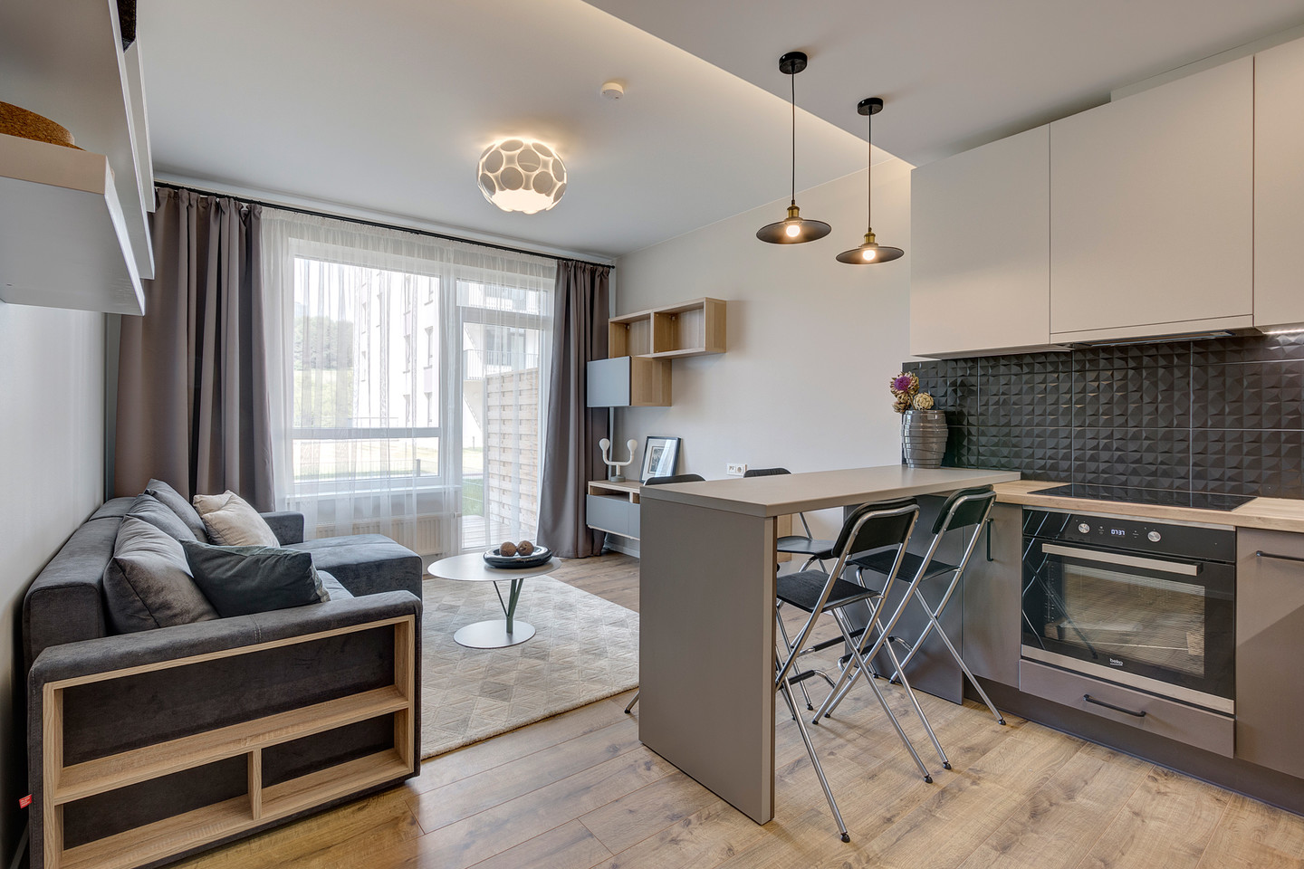 Nedidelio ploto būstą paversti jaukiais namais – tokio prašymo sulaukė interjero dizainerė Gintarė Kazlaitė. Ramybės atspalvio paieškoms naudoti nuosaikūs tonai ir natūralių medžiagų faktūros. Kontrastui naudojami subtilūs akcentai – juodos spalvos detalės. Miegamojo erdvės pagrindinė siena dekoruota medžio lentomis, kurios suteikia šilumos ir gyvybės. Bendru interjero vardikliu tapo paprastumas ir subtilumas.