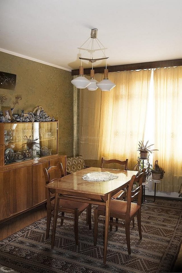Šie analogai gan geras pavyzdys, kaip turėdami didesnę patalpą gyventojai eksperimentuodavo su gyvenamąja erdve. Kaip galime pastebėti, vėlgi dominuoja akcentinis kilimas, karkasiniai spindų baldai, kurie būdavo dalijami į keletą komponentų ir pastatomi skirtingose patalpos vietose. Grindų dangai pasirinktas medžio masyvo parketas, kuris taip pat buvo gaminamas centralizuotai, dažniausiai tai buvo ąžuolo masyvas.