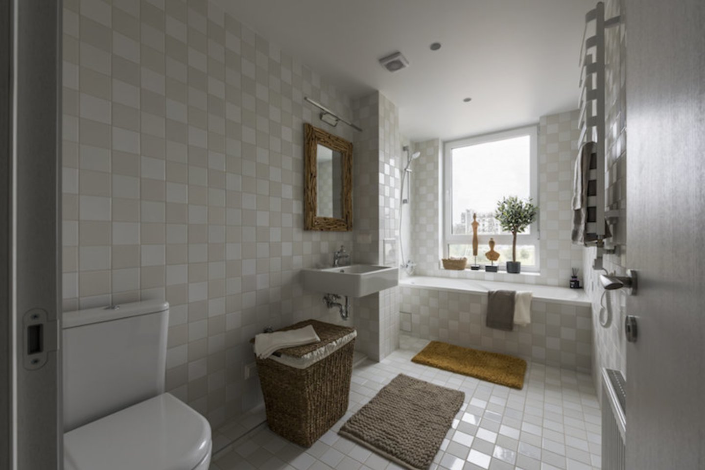 Vienas iš pavyzdžių vonios kambario apipavidalinimui. Kaip žinia, to laikmečio architektūriniuose sprendiniuose vonia ir tualetas buvo dvi atskiros patalpos. Vonios kambarys buvo itin maža patalpa, kurioje įkomponuoti kažką papildomo buvo itin sunku arba visai neįmanoma, kaip pvz. skalbimo mašiną. Sienų apdailoje – standartinės baltos keramikinės plytelės, be galimybės interpretacijoms, grindų danga beveik analogiška, skiriasi tik plytelių išmatavimai. Norint pakeisti ar demontuoti tarp sienų įmontuotą vonią, kildavo didžiulis iššūkis.