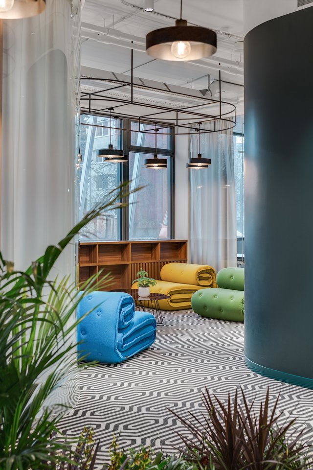 Privačios darbo studijos prisišlieja prie išorinių pastato sienų, todėl į jas patenka natūrali šviesa, o bendrų erdvių interjere akcentuojamos tam tikros zonos: gausi augalų salelė, poilsio zona su minkštais foteliais ir virtuvėle, neformali poilsio vieta, kur galima ištiesti kojas, simbolinio „Monday Office“ fotelio kampelis, norintiems pabūti vieniems. Interjero akcentus vienija atsikartojantis unikalių šviestuvų sprendimas. Spalvų parinkimas yra viena iš interjero ašių. Čia svarbus kontrastas tarp intensyvios, sodrios bendrosios erdvės ir neutralių, ramių tonų darbui skirtose studijose. Patalpos suprojektuotos taip, kad lengvai prisitaikytų prie dinamiškų verslo poreikių. Jos gali augti arba trauktis priklausomai nuo čia įsikūrusių komandų dydžio. Šiam poreikiui paklusta ir pertvaros, ir apšvietimas.