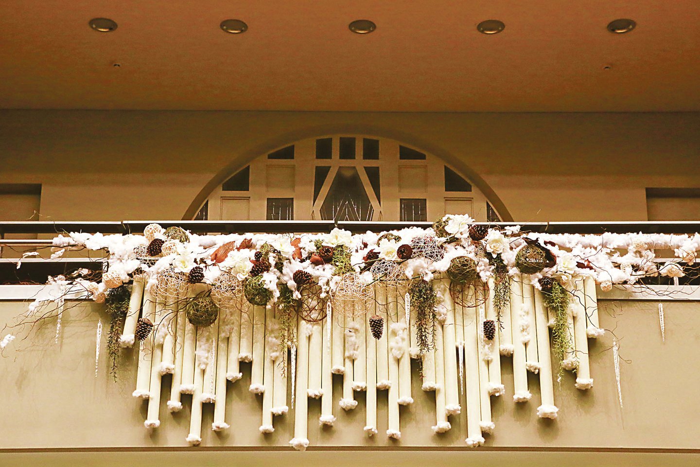 Kauno valstybinėje filharmonijoje Kalėdų eglės nėra, tačiau šventinę nuotaiką kelia įspūdinga dekoracija, puošianti pagrindinėje salėje virš scenos esantį balkoną. Ji primena stilizuotus vargonus.