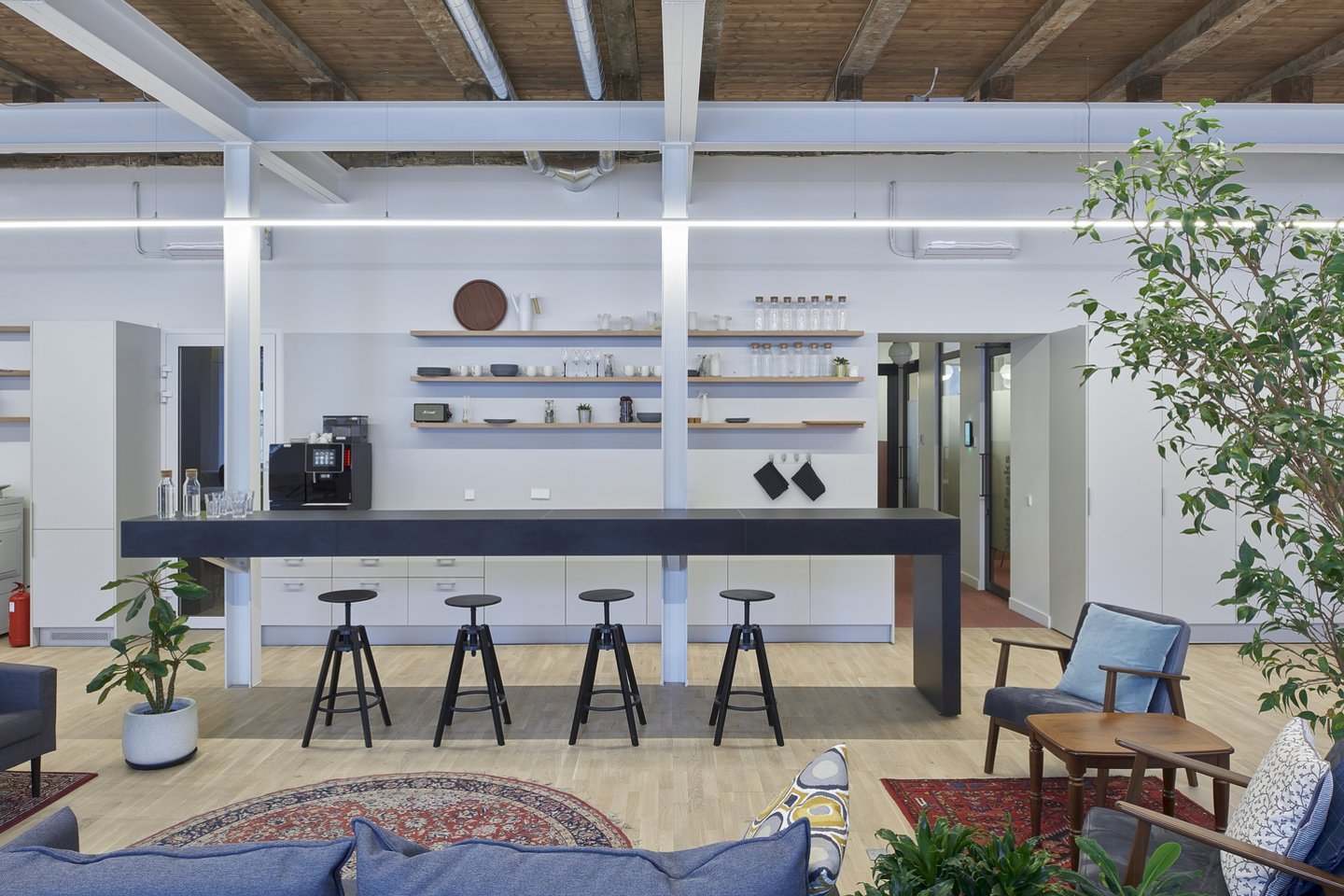 Detalės dar labiau išryškinamos baltų sienų ir juodų lubų plokštumose. Nedidelės bendradarbystės erdvės pasiekiamos iš koridoriaus, kuriame atidengiamos senos medinės grindys. Šviesa į koridorių patenka per stiklines duris bei langus. Koridoriaus gale – tamsi erdvė pasislėpti. Ties kampiniu įėjimu į pastatą, penkiakampio formos erdvėje, patalpos centre planuojamas apvalus baras.