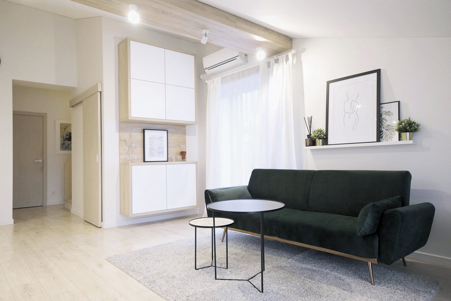 Nors gali pasirodyti, kad poros namų interjere viskas suplanuota ir suderinta pagal vieną tvarką, šeimininkė greitai skuba šią mintį paneigti. Pavyzdžiui, žalia spalva ir jos elementai erdvėje atsirado po to, kai šeimininkai po žiemos švenčių atsisveikino su Kalėdų egle.