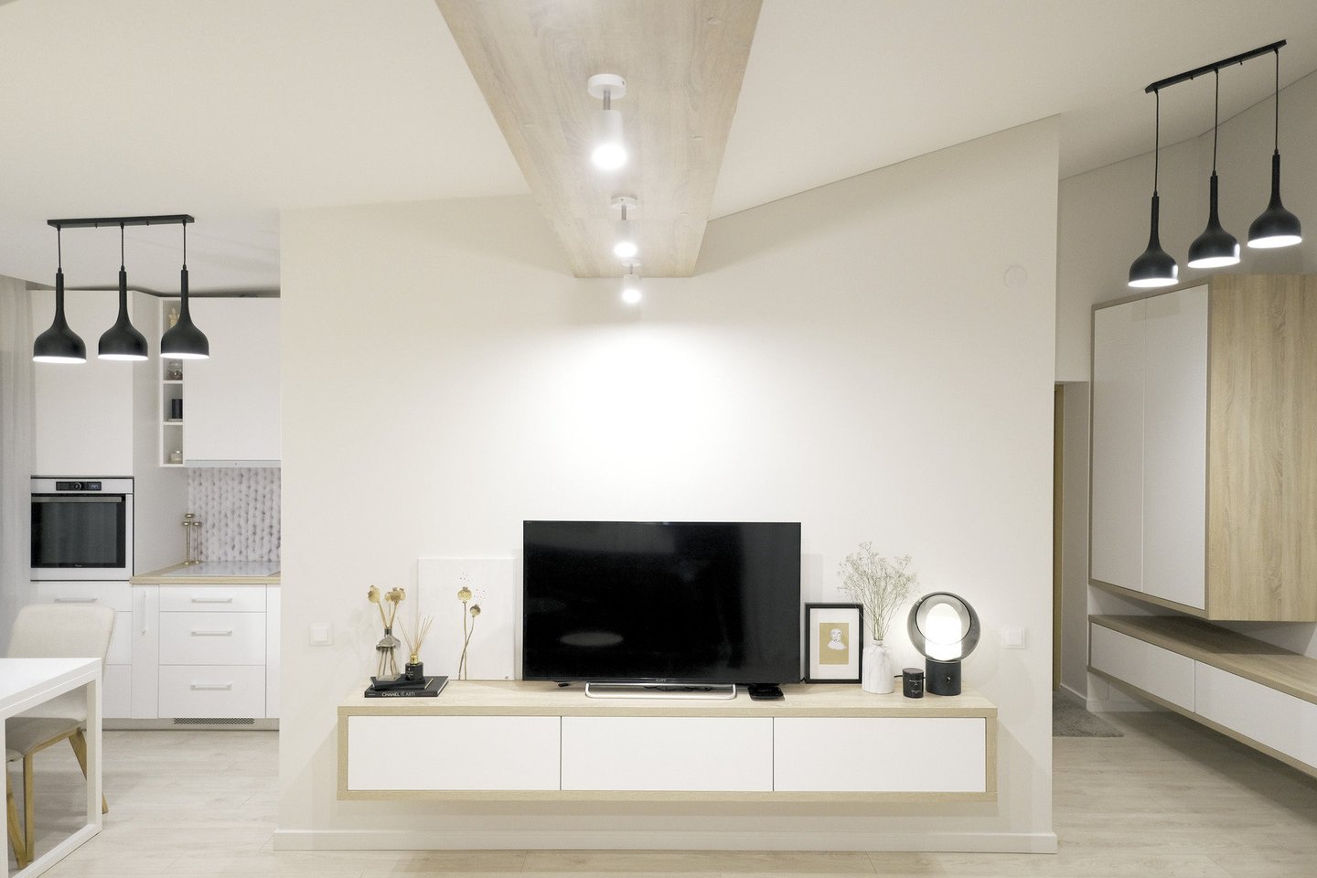Po šviesų būstą Akvilė vedžiojo ramiu žingsniu. Ramybė ir jaukumas juntamas ir šeimos namuose – dominuojanti šviesių spalvų paletė sulėtina, pašalinio triukšmo nejusti nei poros gyvenime, nei jųdviejų namuose.