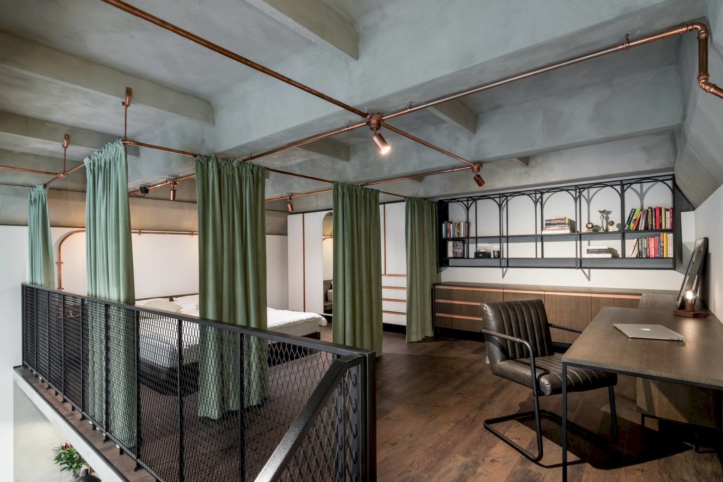 Čia atnaujinti betono paviršiai puikiai dera su žaliais namų tonais, medienos, metalo ir aksomo detalėmis, o akcentu tapo atvira vario elektros instaliacija.