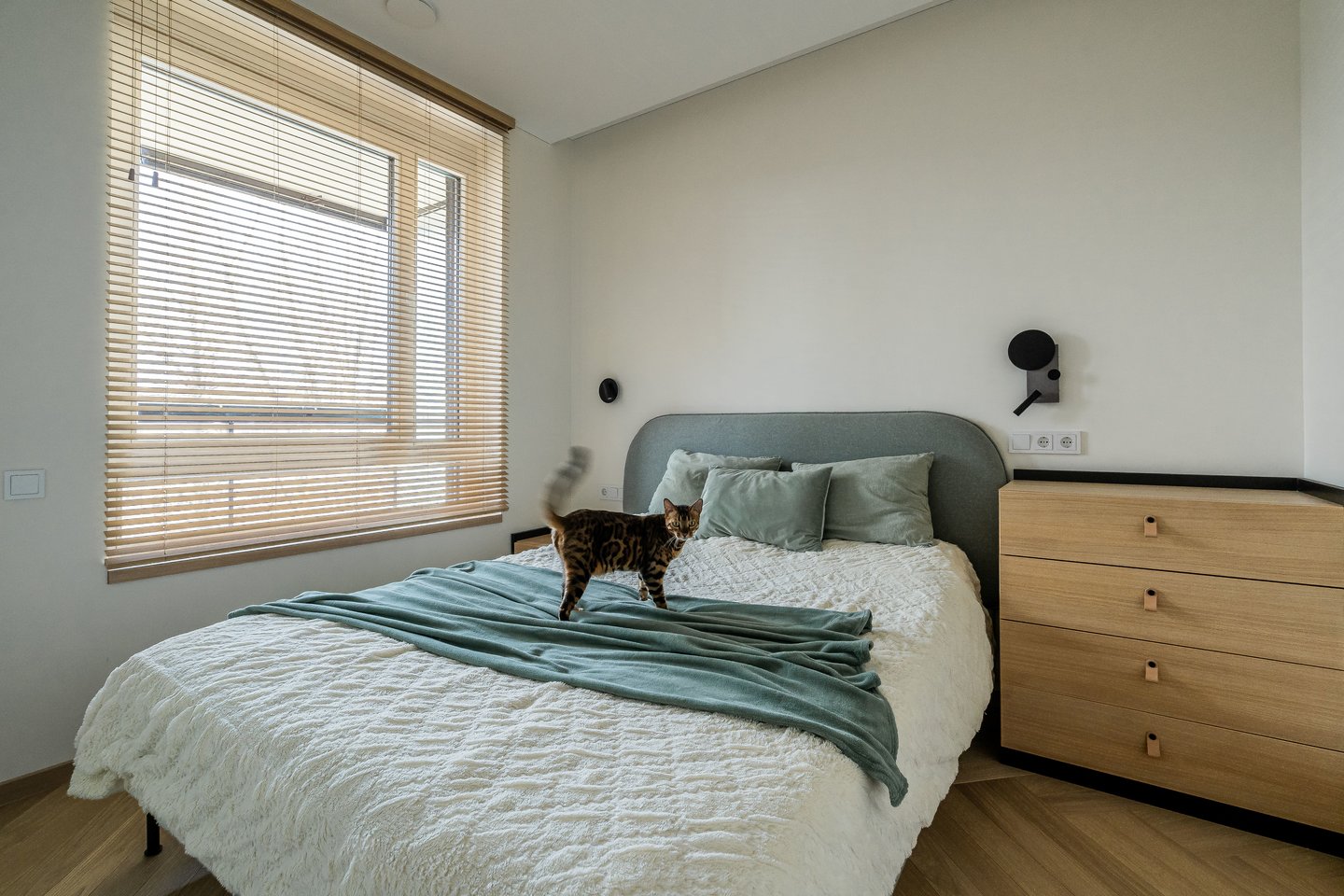 Šalia katino poreikių, turi tilpti daug poros intensyvaus gyvenimo, mokslo ir nuotolinio darbo erdvės, didelis dėmesys skirtas ir pomėgiui gaminti, daug knygų ir sporto inventorius. Tam išnaudotas visas bendrojo kambario perimetras su palangės panaudojimu darbo stalui, lentynos per visą aukštį, daug integruotų spintų su veidrodžiais.