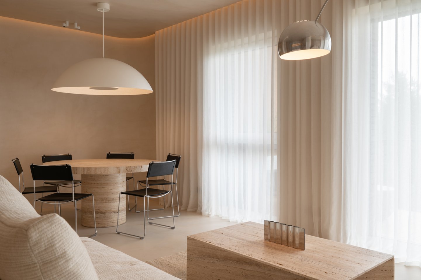 Visos bute naudotos medžiagos yra natūralios. Pasirinktas travertino akmuo, ąžuolo lukštas, mikro cemento dangos, linas, nerūdijantis plienas ir kiti kokybiški, ilgaamžiai sprendimai.