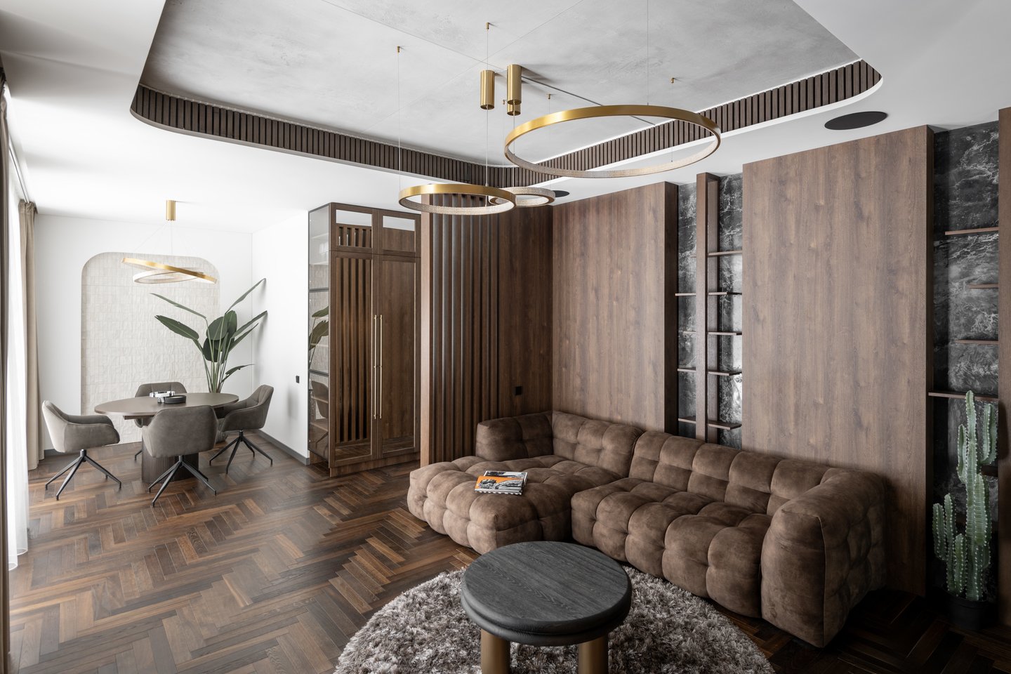 Nors interjere naudojamos tamsios spalvos, natūrali šilto medžio apdaila sukuria jaukių namų aurą.
