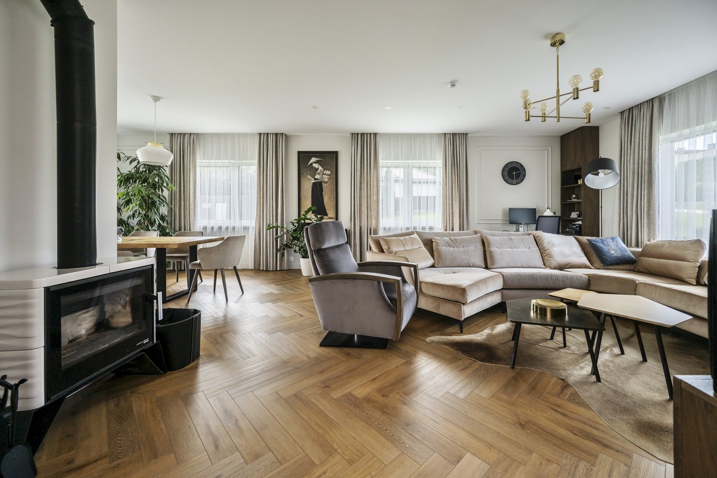 Svetainės ir miegamųjų sienos dekoruotos sodresniais žemės tonų ir aukso spalvos tapetais. Suprojektuoti ir Lietuvos gamintojų pagaminti nauji svetainės ir darbo erdvės baldai, nauja tamsesnė sofa, valgomojo baldai ir užuolaidos.