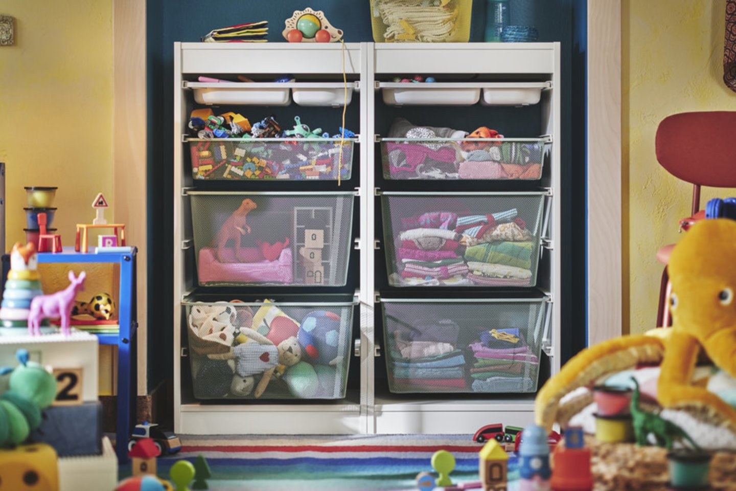 Svarbiausias tvarkingo vaikų kambario elementas – aiški vieta kiekvienam daiktui. Kai vaikai žino, kur ir kas turi būti padėta, jiems daug lengviau susitvarkyti patiems. Pavyzdžiui, TIGERFINK dėtuvė su skyreliais (14 Eur) yra minkšta ir lankstaus dizaino, todėl puikiai tinka pliušiniams žaislams. Kitas puikus sprendimas – BARNDRÖM dėžutės su skaičiais. Kartu su vaikais galima susitarti, kad, dėžutė nr. 1 bus skirta knygoms, nr. 2 – smulkiems žaislams. Tokia sistema ne tik lengviau primins, kur kas turi būti padėta, bet ir mokys mažuosius asociacijų, atsakomybės bei padės dažniau įsitraukti į tvarkymosi žaidimus.