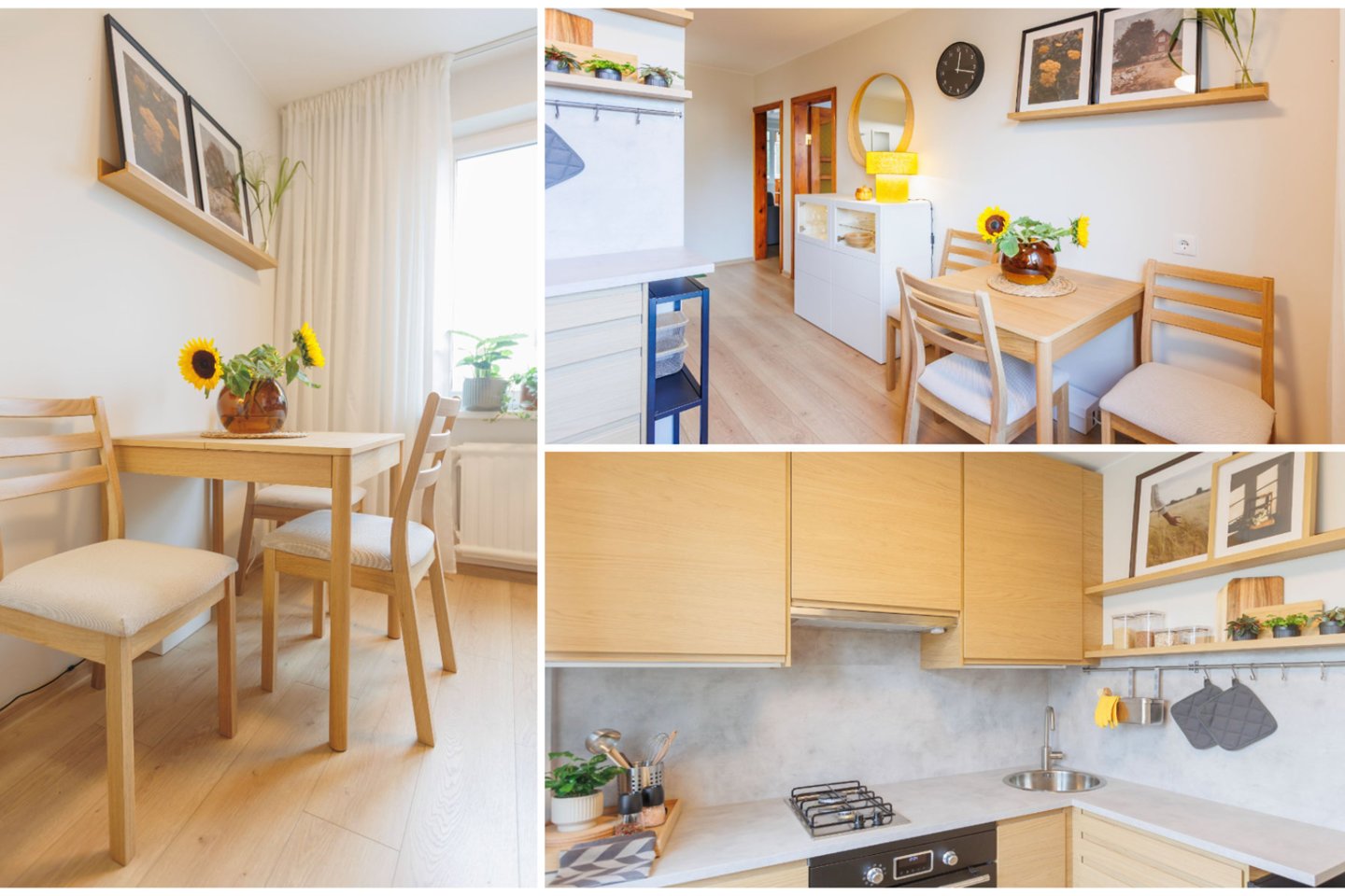 Šeimai svarbiausia buvo suderinti funkcionalumą ir jaukumą. Gintarės mama ir močiutė norėjo, kad ši erdvė būtų tinkama tiek kasdieniam maisto gaminimui, tiek ramiems vakarams ar svečių priėmimui. Nors vietos buvo nedaug, šeimininkės pageidavo turėti valgomojo stalą ir patogiai pasiekiamoje vietoje įrengtą mikrobangų krosnelę, kad močiutė galėtų be vargo pasišildyti maistą, trūko vietos daiktų pasidėjimui.
