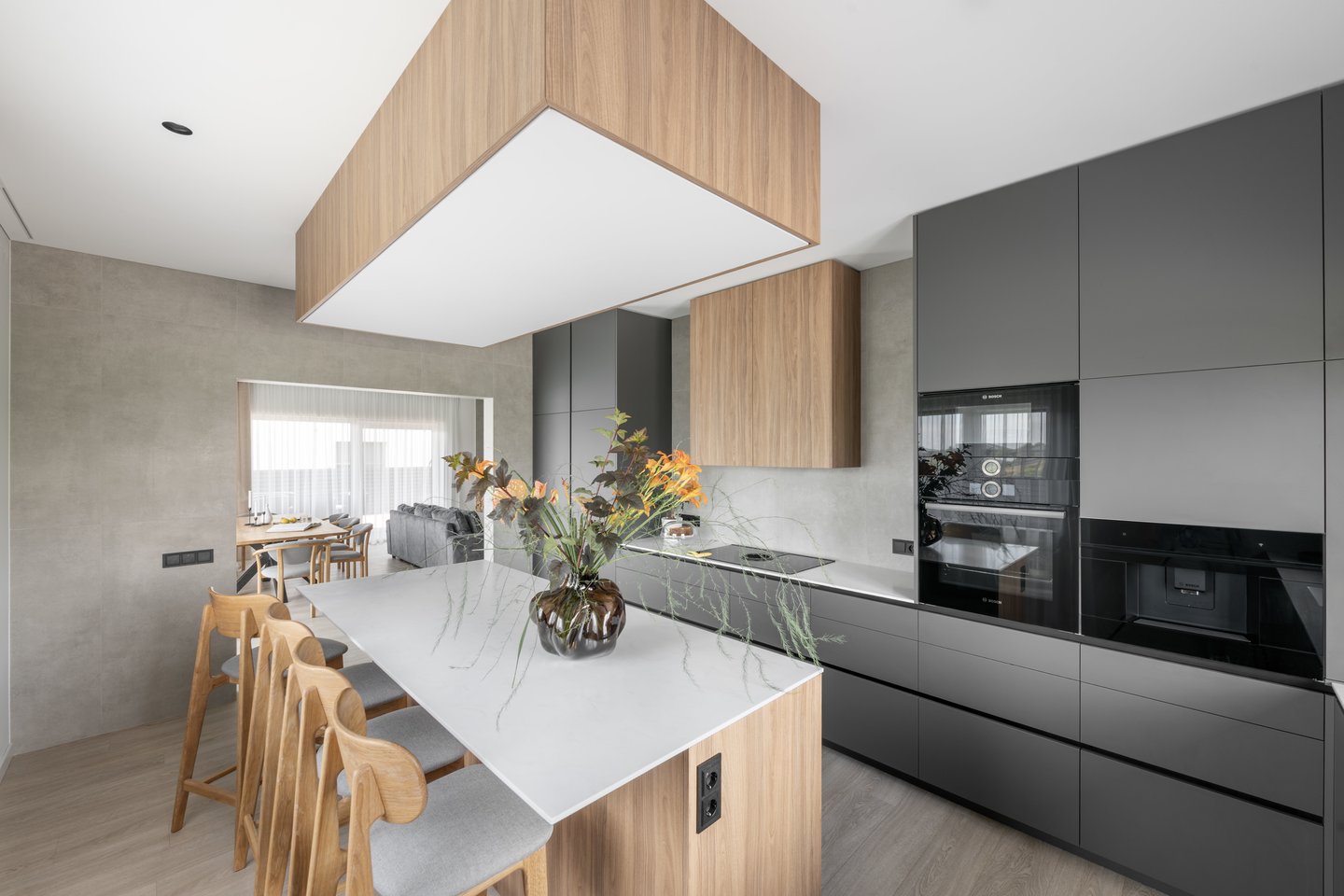 Visi šviestuvai projektuoti minimalistiški, daug įleidžiamų siekiant pabrėžti patalpų architektūrą. Virš virtuvės salos numatytas didelis, lakoniškas stačiakampio formos šviestuvas, atkartojantis salos dydį – šviesos plokštuma užtikrina tiek funkcionalumą, tiek estetiką.