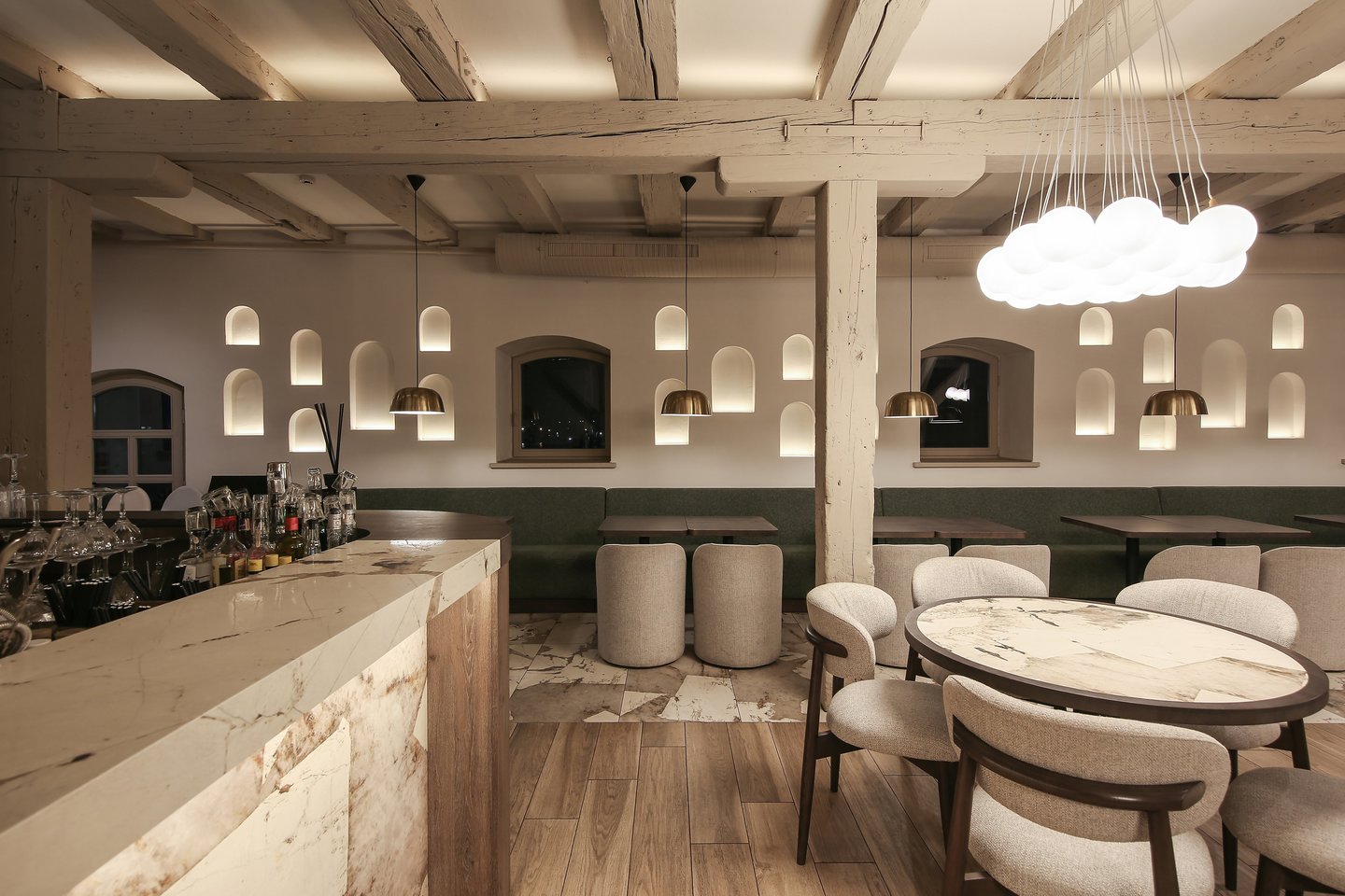 Arkos forma panaudota ir sienų nišoms, kurių paslėptas pašvietimas taip pat papildomai apšviečia patalpą. Arkų formų gausa vizualiai sukuria dekoratyvaus ir užpildyto interjero įspūdį, kurį dar labiau sustiprina ryškų Patagonia akmens raštą imituojančios sienų ir grindų plytelės.