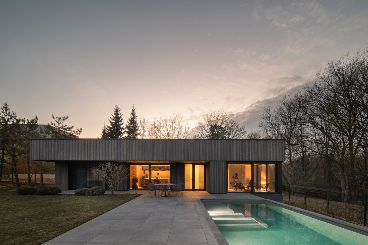 Interjere dominuoja natūralus medis, atspindintis žemės ir rankų darbą, bei juodi akcentai, suteikiantys erdvei ritmikos ir tvirtumo. Minimalistinė estetika neužgožia žalumos ir ramybės, matomus pro langus, o medžiagų faktūros darniai susilieja su gamta.