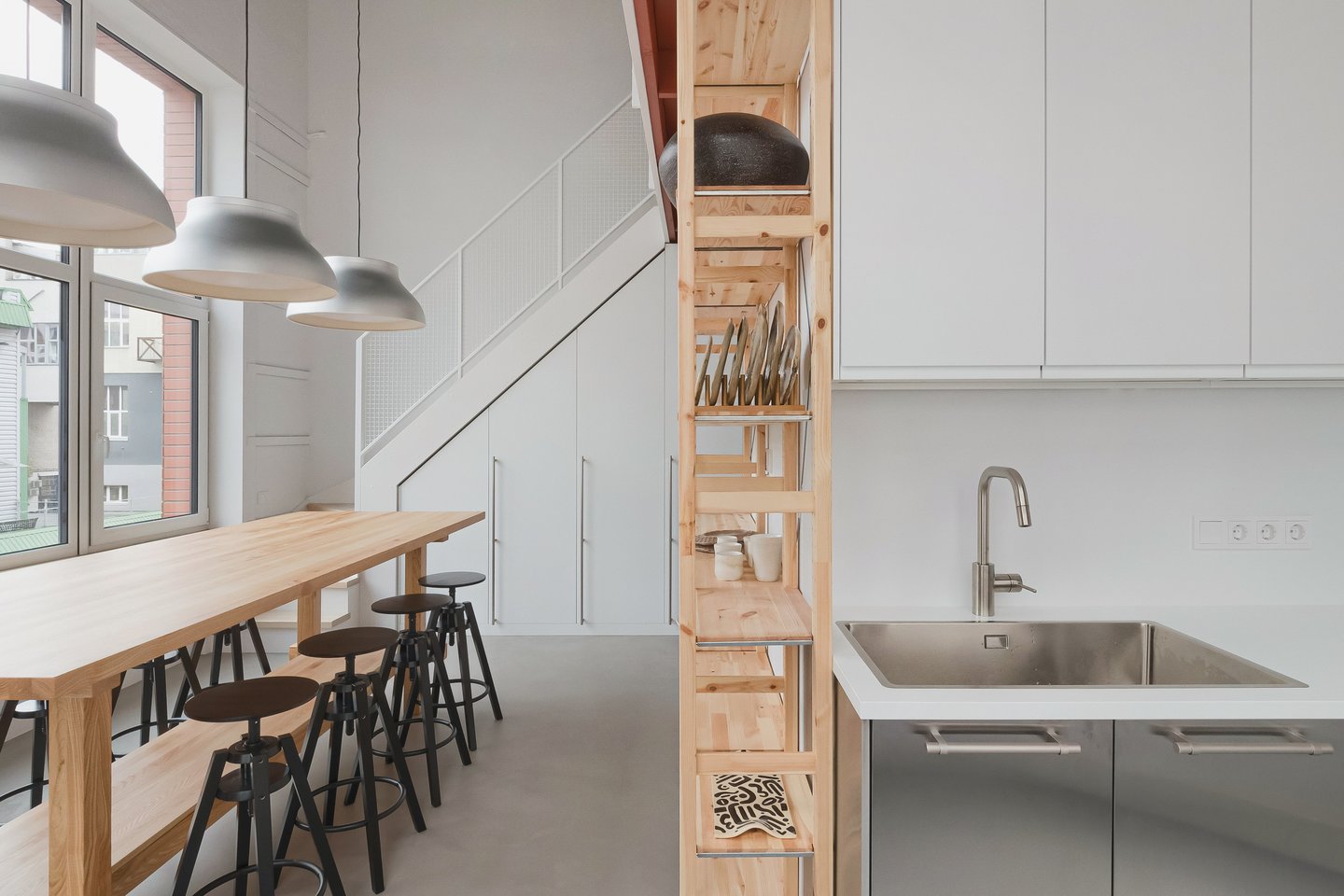Studijos interjeras išsaugo vietos autentiškumą: aukštos lubos, plačios langų angos ir subtiliai atnaujintos betoninės grindys kuria atvirą, šviesią ir įkvepiančią atmosferą.