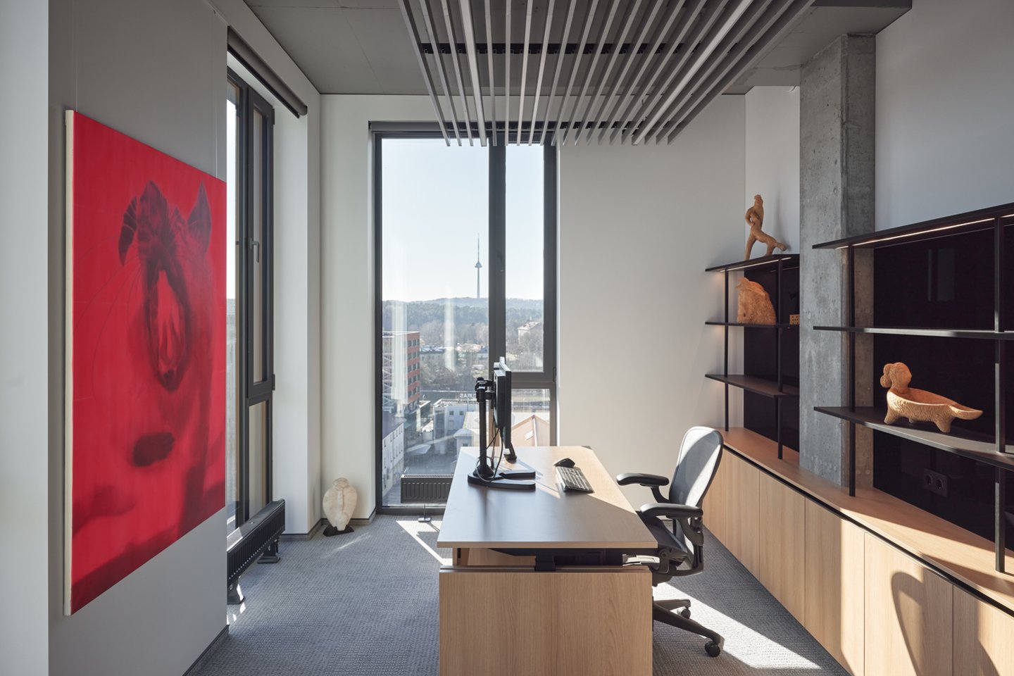 Panoraminiai langai, aukštos lubos ir protingai išdėstyti apšvietimo sprendimai padeda sukurti įkvepiančią atmosferą. Tai biuras, kuriame svarbu ne tik tai, ką darai, bet ir kaip jautiesi tai darydamas.