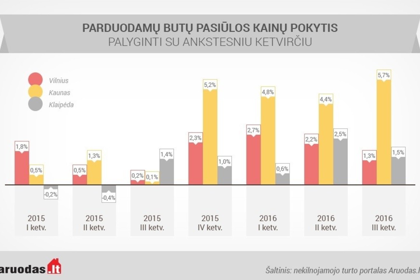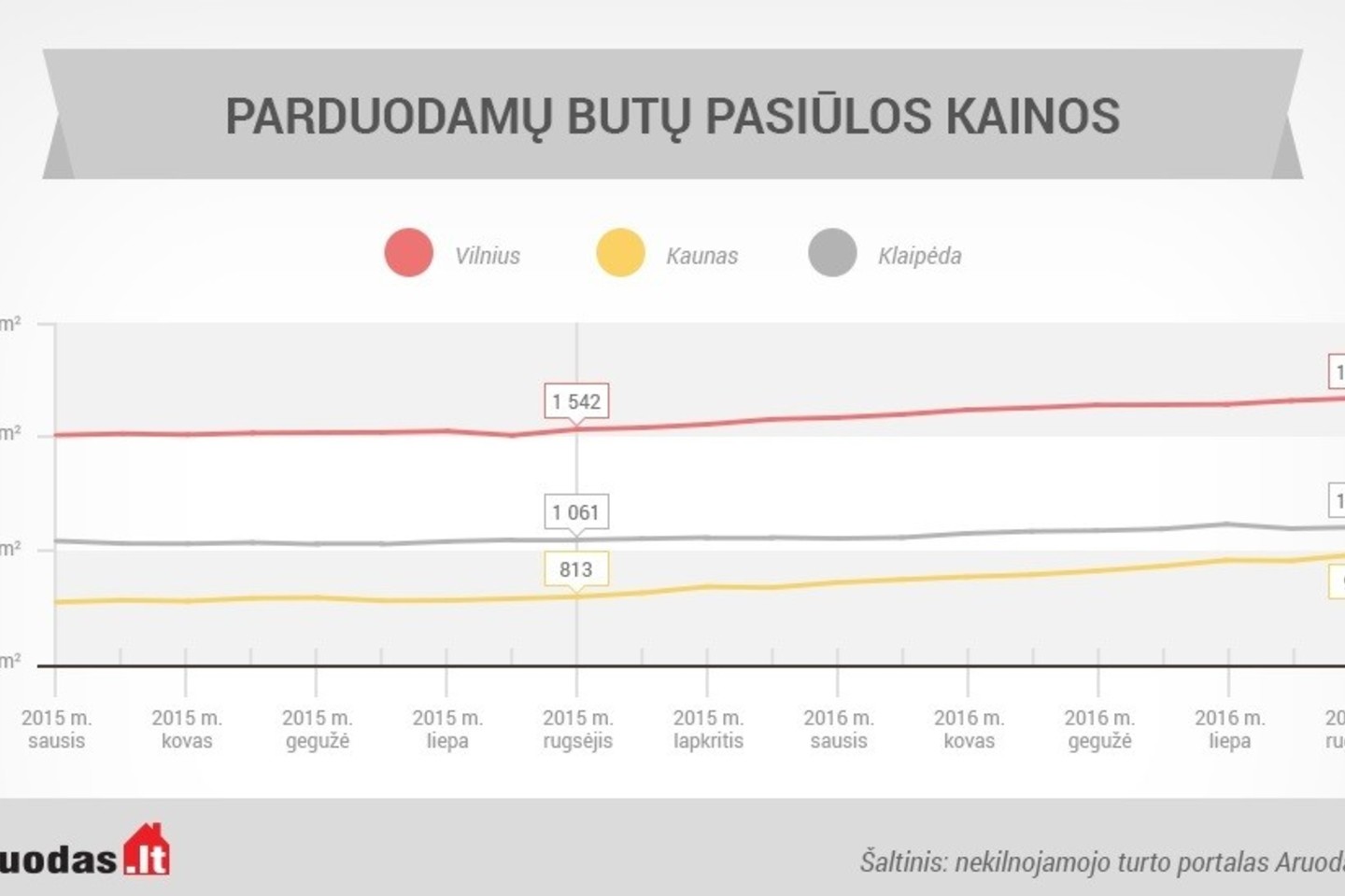 Informacija parengta, remiantis lankomiausiame nekilnojamojo turto portale Aruodas.lt publikuotais skelbimais. Vidutinės pasiūlos kainos skaičiuotos neatsižvelgiant į konkrečią būsto vietą ar kitus ypatumus, išskyrus nurodytus tekste ar statistikos grafikuose.