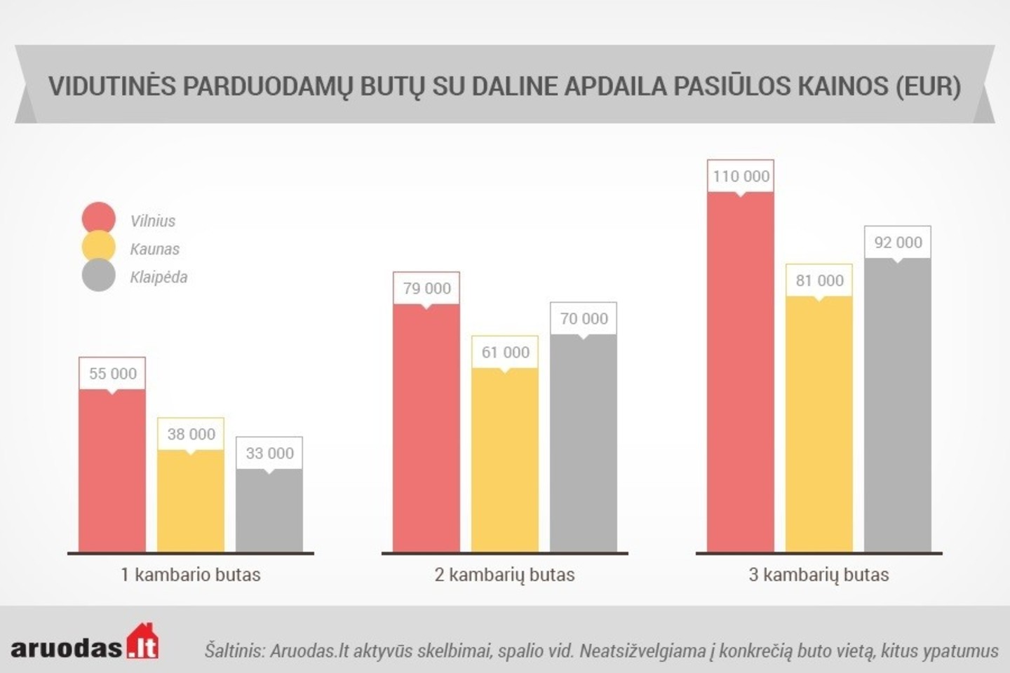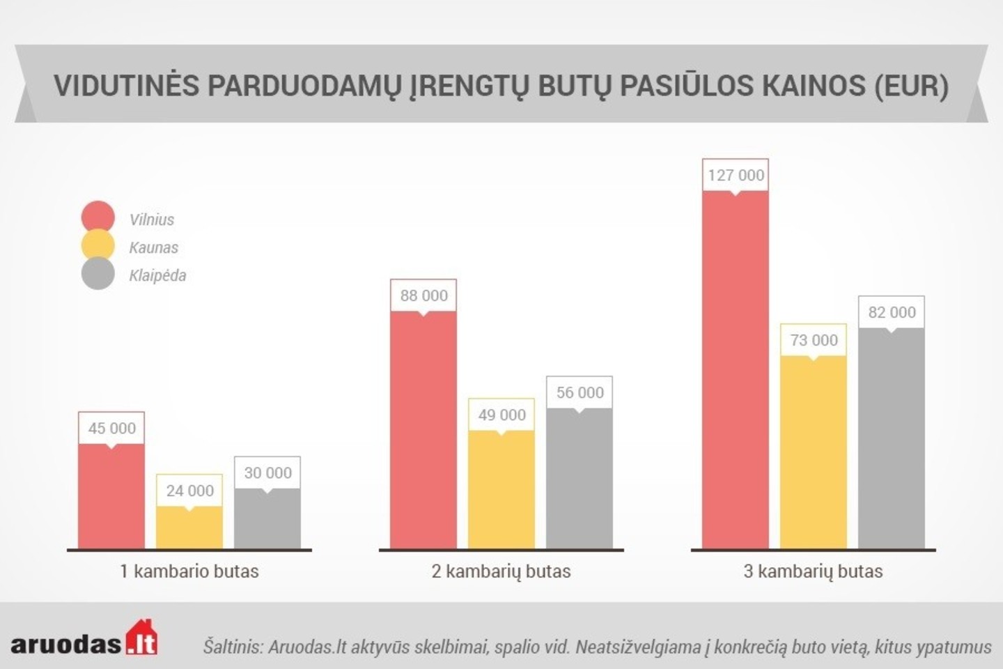 Ieškantiems įsigyti įrengtą butą, Aruodas.lt skaičiuoja, kad šiuo metu vidutinė vieno kambario įrengto buto sostinėje kaina skelbimuose yra apie 45 000 eurų, Kaune – apie 24 000 eurų, Klaipėdoje – apie 30 000 eurų. Už dviejų kambarių įrengtą butą prašoma vidutiniškai 88 000 eurų Vilniuje, 49 000 eurų Kaune ir 56 000 eurų Klaipėdoje.