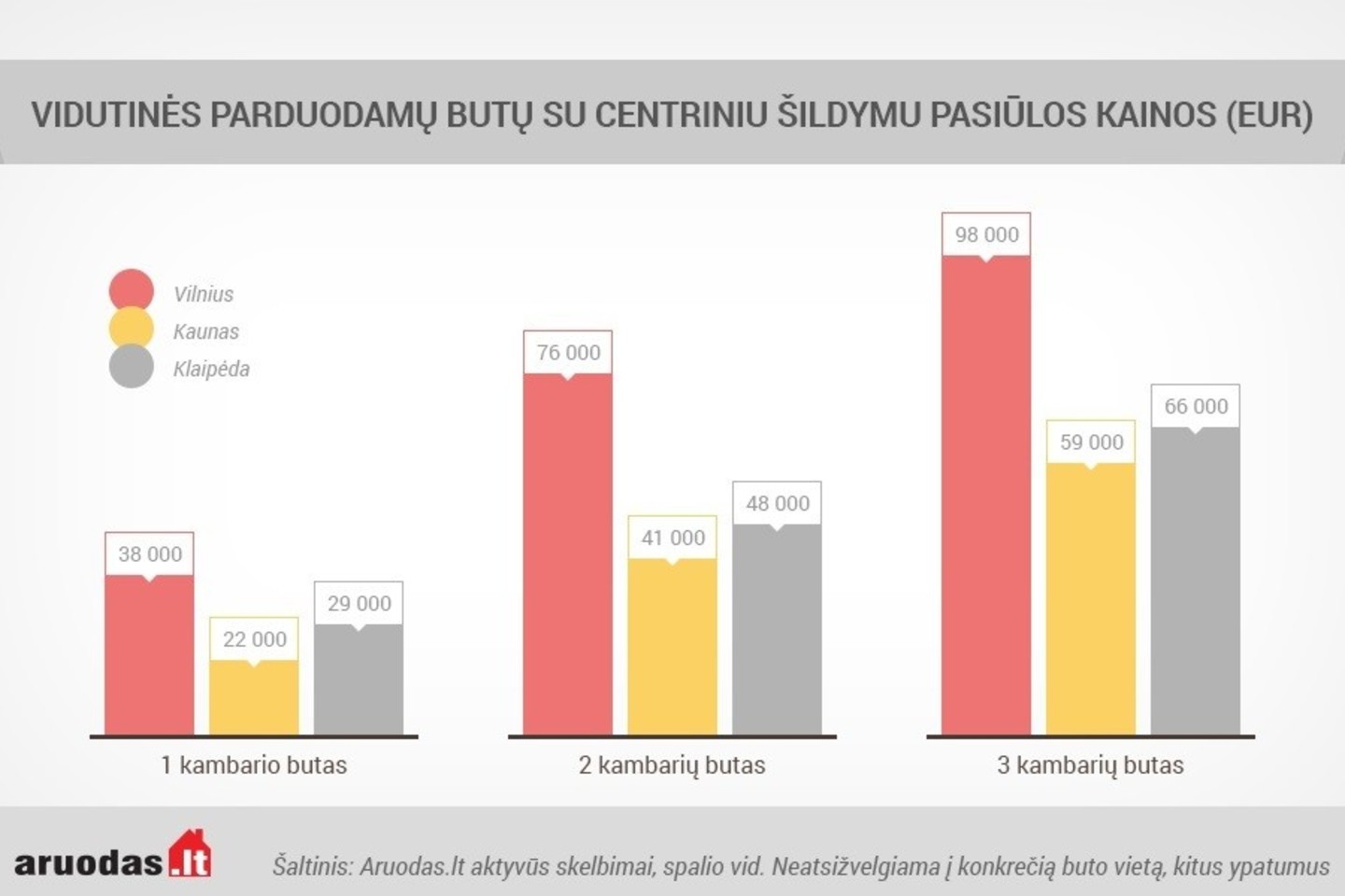 Vieno kambario buto vidutinė pasiūlos kaina siekia apie 60 000 eurus Vilniuje, 40 000 eurus Kaune ir 35 000 eurus Klaipėdoje. Už dviejų kambarių butus su centriniu kolektoriniu šildymu šiuo metu tikimasi gauti vidutiniškai 86 000 eurus sostinėje ir 75 000-76 000 eurus Kaune ar Klaipėdoje.