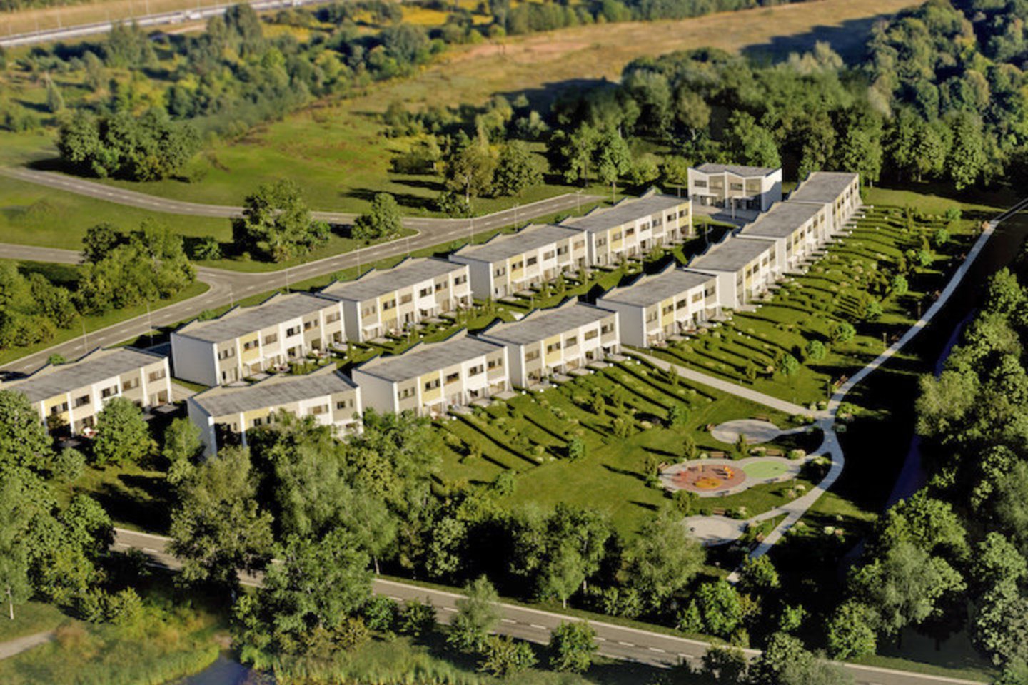 Kvartalo architektūrinė koncepcija suteiks ne vieną privalumą būsimiems gyventojams. Kiekvienas butas turės atskirą įėjimą iš lauko, nuosavą kiemelį ir terasą, vietą automobiliui, už kurią nereikia mokėti. Iš viso bus pastatyta dvi eilės nedidelių dviejų aukštų namų po 4-7 butus. Planuojant kvartalą kalvotas vietovės reljefas išnaudotas taip, kad visi butai turėtų atvirą vaizdą į gamtą. Tiek pirmoji, tiek ir antroji namų eilė galės mėgautis atsiveriančiu vaizdu į parką ir ežerus. Be to, visų butų terasos orientuotos į vakarus.