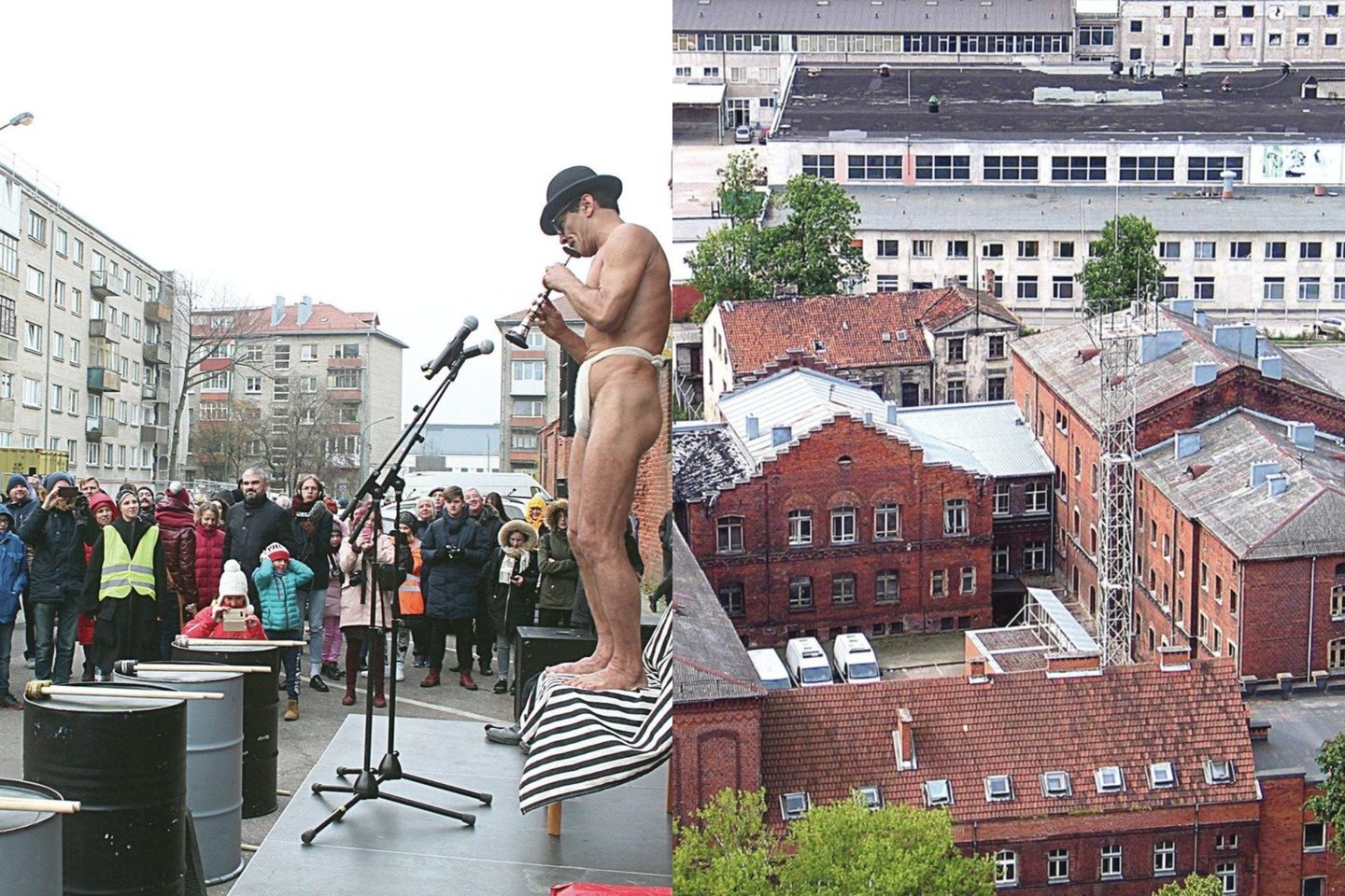 Aktorius ir režisierius Benas Šarka ryžosi drastiškai gatvės meno akcijai – vėsiu oru žiūrovų akivaizdoje jis apsinuogino, grodamas dūdele skleidė šiurpius pavojaus ir nerimo signalus.