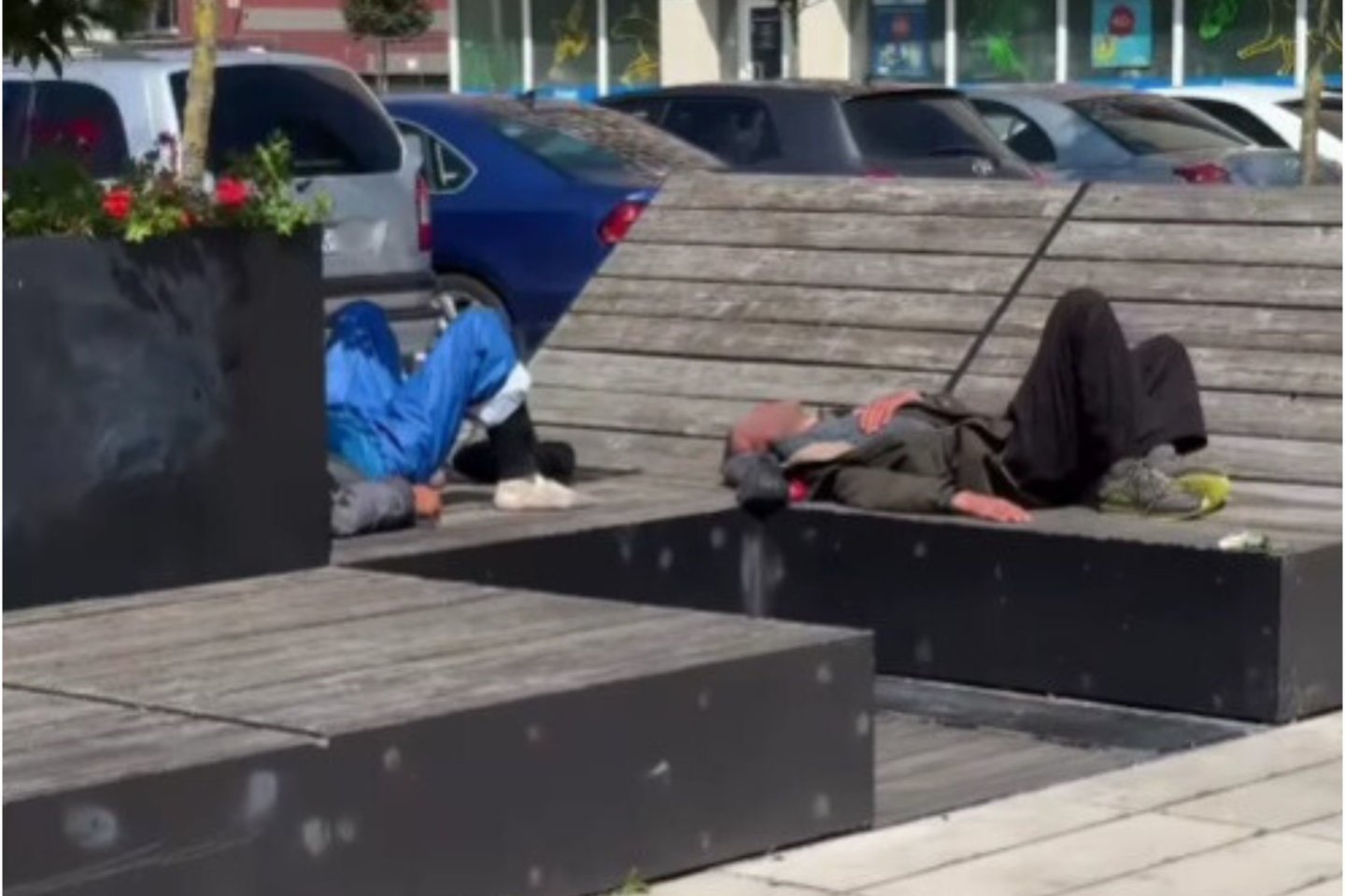 Vaizdo įrašas Klaipėdos veidas be grimo grupėje socialiniame tinkle išplito sekmadienio vakarą. Neapsikentęs praeivis nufilmavo, kaip ant aikštės viduryje esančių gultų lėbauja įsitaisę neblaivūs asmenys.
