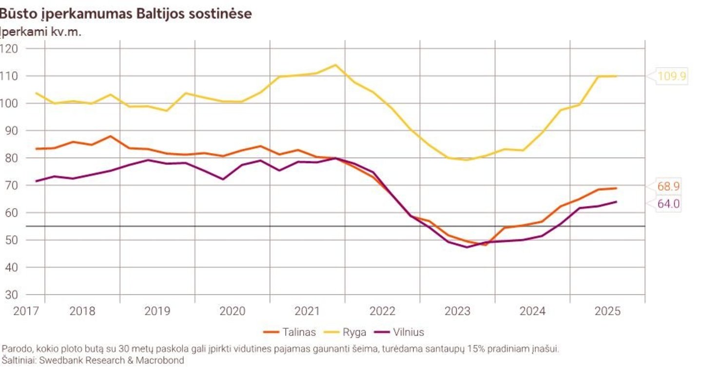 Būsto įperkamumas Vilniuje išlieka žemiausias tarp Baltijos valstybių. Taline gyventojai vidutiniškai gali įpirkti beveik 69 kv. m., o Rygoje, dėl itin didelio senų ir nerenovuotų daugiabučių skaičiaus, net 110 kv. m. Pirminėje rinkoje rygiečių galimybės gerokai kuklesnės – ten vidutines pajamas gaunanti šeima įperka vos 57 kv. m.