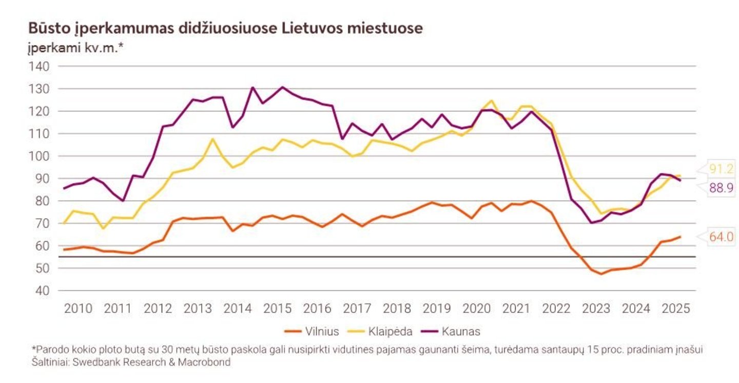 „Swedbank“ skaičiavimais, vidutines pajamas gaunantys vilniečiai šiuo metu gali įpirkti 64 kv. m. dydžio butus, o per ketvirtį jų įperkamas plotas padidėjo kiek mažiau nei dviem kvadratiniais metrais. Tuo metu Klaipėdoje gyventojų įperkamumas yra geriausias tarp didžiųjų miestų ir siekia apie 91 kv. m. Kaune būsto kainos augo sparčiau nei atlyginimai, tad būsto įperkamumas net šiek tiek sumažėjo, tačiau yra didesnis nei sostinėje ir siekia beveik 89 kv. m.