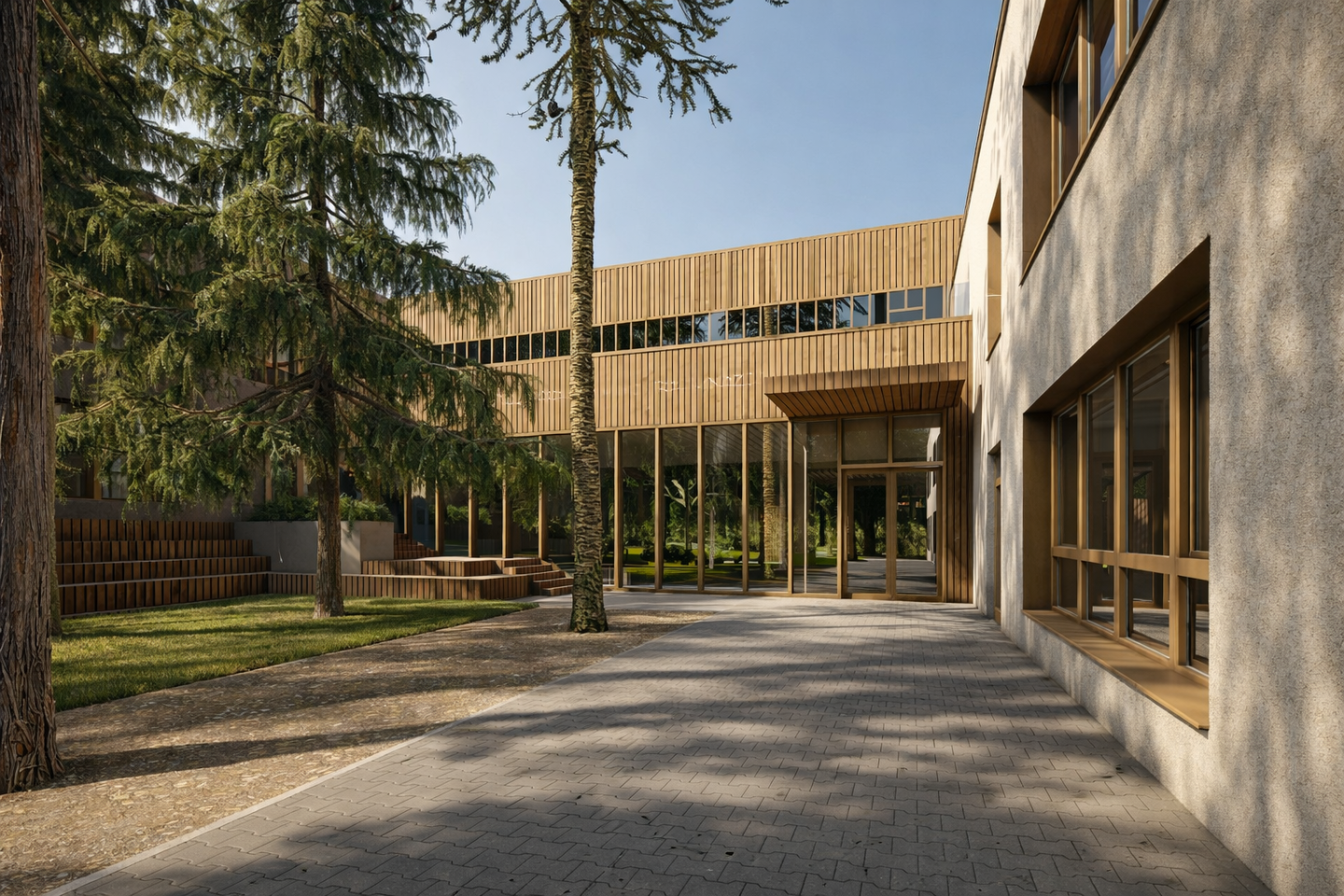„Projektuojamas naujas trečiasis mokyklos korpusas organiškai papildo esamą ansamblį, o naujos bendro naudojimo erdvės tampa jungiamąja grandimi. Skaidri aula sujungia lauko ir vidaus erdves į vientisą socialinį centrą, skirtą neformaliajam ugdymui ir bendruomenės renginiams. Viduje suprojektuotas amfiteatras natūraliai pratęsiamas pastato išorėje, taip integruojant architektūrą į esamą reljefą. Tuo tarpu kiemas su terasomis aplink saugomus medžius ir vizualinis ryšys su sporto sale sukuria jaukią, atvirą atmosferą mokyklos kasdienybei“, – teigia „501 architects“ architektė Vaida Norkūnaitė.