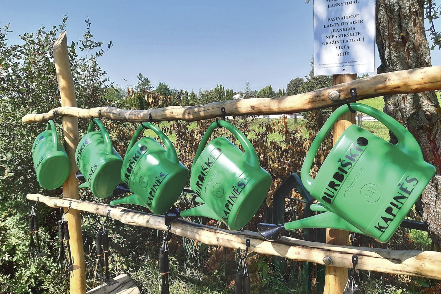 Burbiškio vyrai iš nedidelių rąstų padarė tvirtą stovą, o ant jo buvo sukabinti penki laistytuvai bei ravėjimo įrankiai. Prie jų esančiame skelbime mandagiai primenama, kad šiais daiktais pasinaudoję žmonės nepamirštų pakabinti jų į vietą.