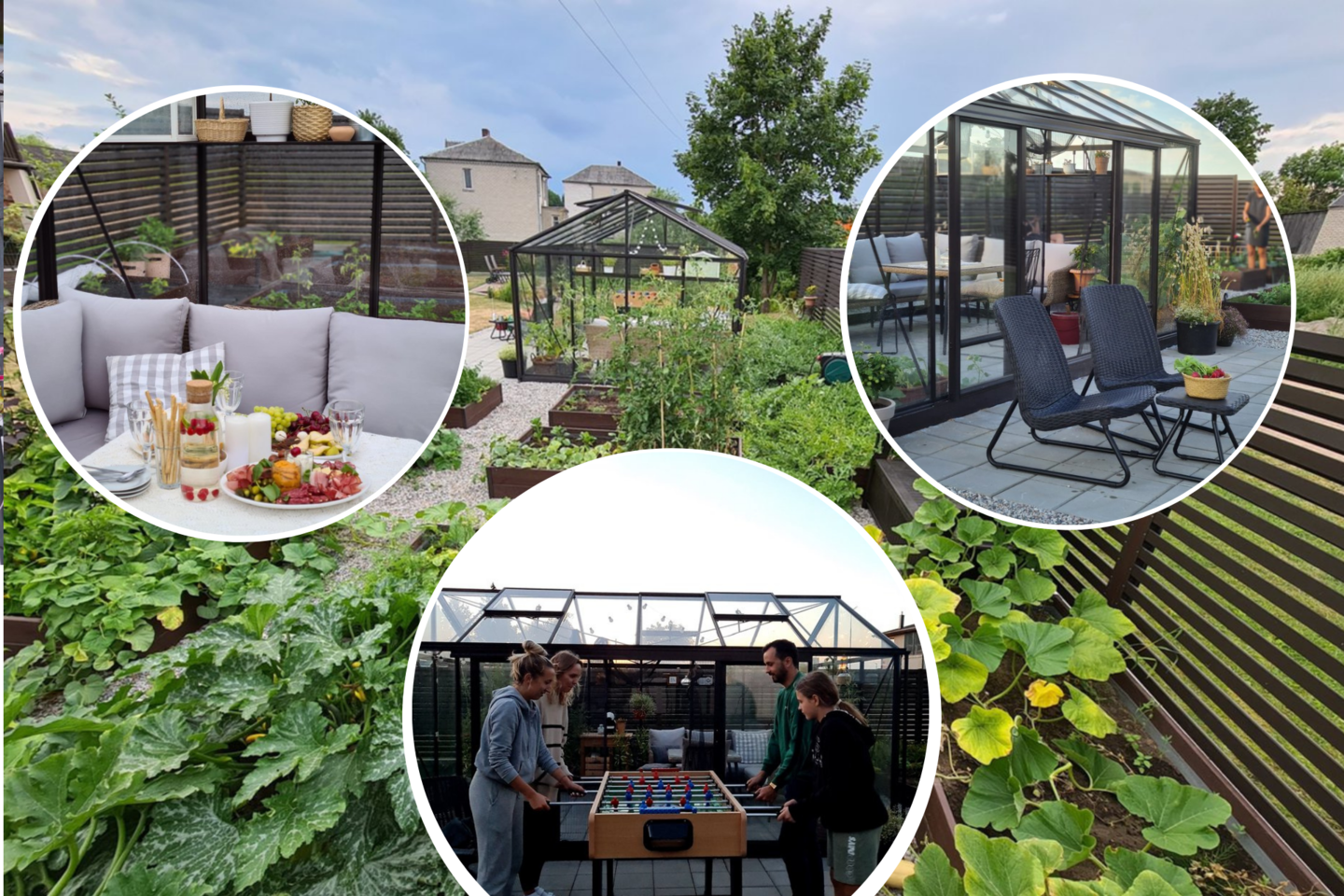 Nors karštą vasaros dieną jame išbūti išties sudėtinga, vakare, juolab vakarinę saulę užstoja klevas, pats metas keltis į jį arba prie jo. Šeimyna išsineša kėdes, įsijungia projektorių ir žiūri vaizdo klipus – tam pritaikė namo sieną. Šiltnamyje vietos rado net stalo futbolo stalas. Jame mielai laiką leidžia vaikai.