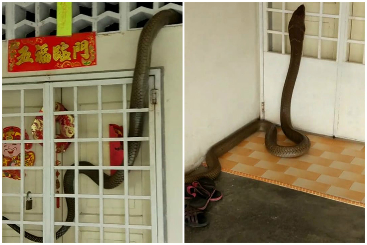 Vieno Malaizijos miesto gyventojas Derrick Yi Fanas užfiksavo itin baugų vaizdą. Jis buvo savo namuose, kuomet išgirdo, kad jo kieme kažką keistai šnarant. Vyras išėjęs į lauką negalėjo patikėti tuo ką mato. Kieme tarp sudėtų daiktų buvo gigantiška itin nuodinga kobra, jos ilgis siekė apie 4 metrus. Vyras bandė visaip ją išvaryti, tačiau įvyko dar blogesnis dalykas, kobra pro virš durų esantį tarpą įsliuogė į vyro namų vidų, tuomet jis į namus žengti jau nebedrįso. Didžiulę kobrą jo namuose sugavo atvykę ugniagesiai.