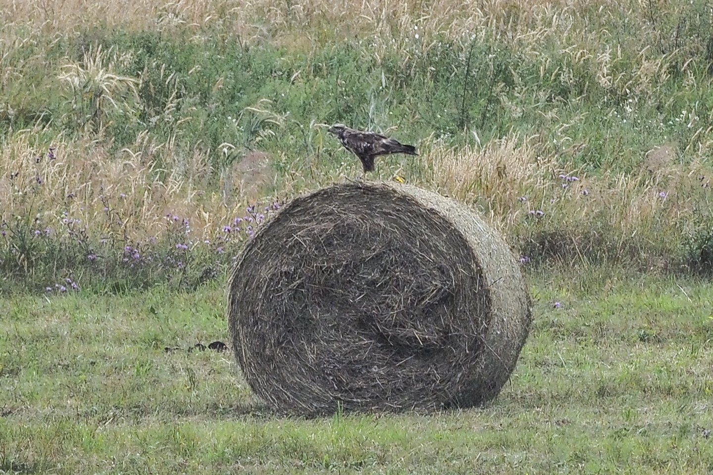 Netrukus patraukėme iš miško pasižvalgyti į aplinkinės pievas – tikėtina, kad jose medžioja suaugėliai. Lyg tyčia, vos išvažiavus iš sengirės, ant šieno ritinio pastebėjime grobį dorojantį mažojo erelio rėksnio suaugėlį. Tai – įrodymas, kokia svarbi ši miško ir aplinkinių pievų dermė retųjų paukščių gyvenimui.