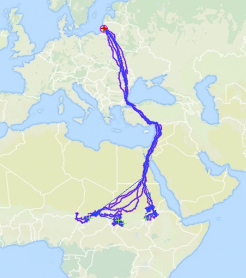 Vienas iš sužymėtų gandrų, spėjama, tapo afrikiečių grobiu