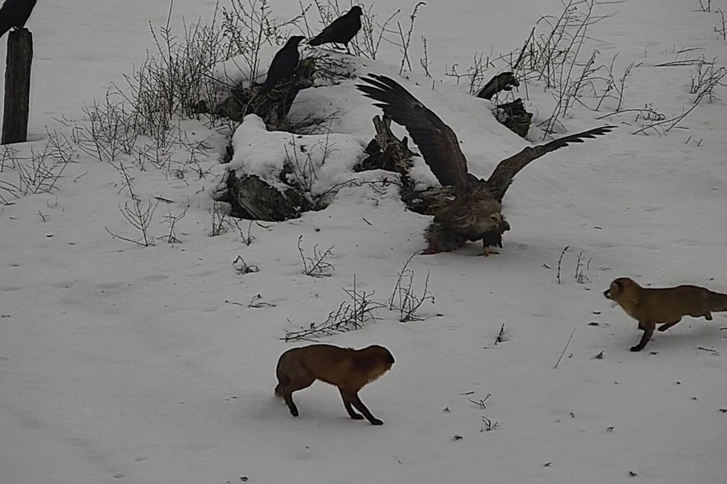 Tai buvo prie Nemuno, kuriuo eina siena su Baltarusija, Lazdijų rajone. Tąkart jūrinis erelis nekonfliktavo su prie jo priartėjusia lape ir palikęs jai grobį nuskrido.