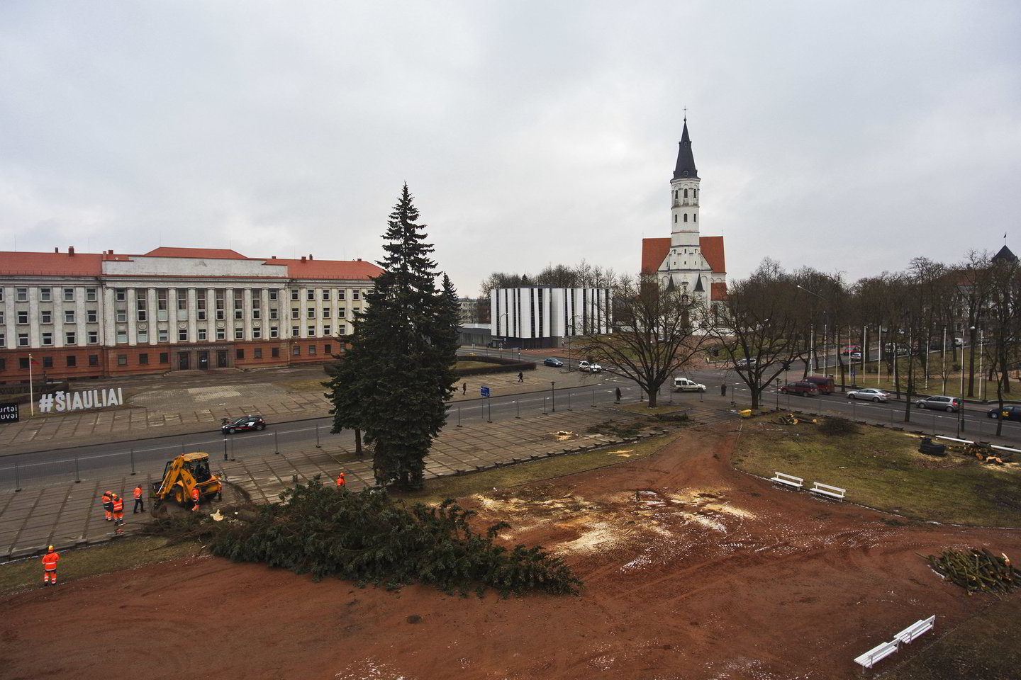 Rangovo „Šiaulių plento“ įmonės darbuotojai pirmiausia pradėjo triūsti pačioje aikštėje, kuri bus iškirsta kone plynai. Dėl išpiltos raudonos skaldelės, kuri po lietaus virsta raudonu purvu, „raudonąja“ vadinamos aikštės per kelias dienas bus pašalinti kone visi – net 43 medžiai.