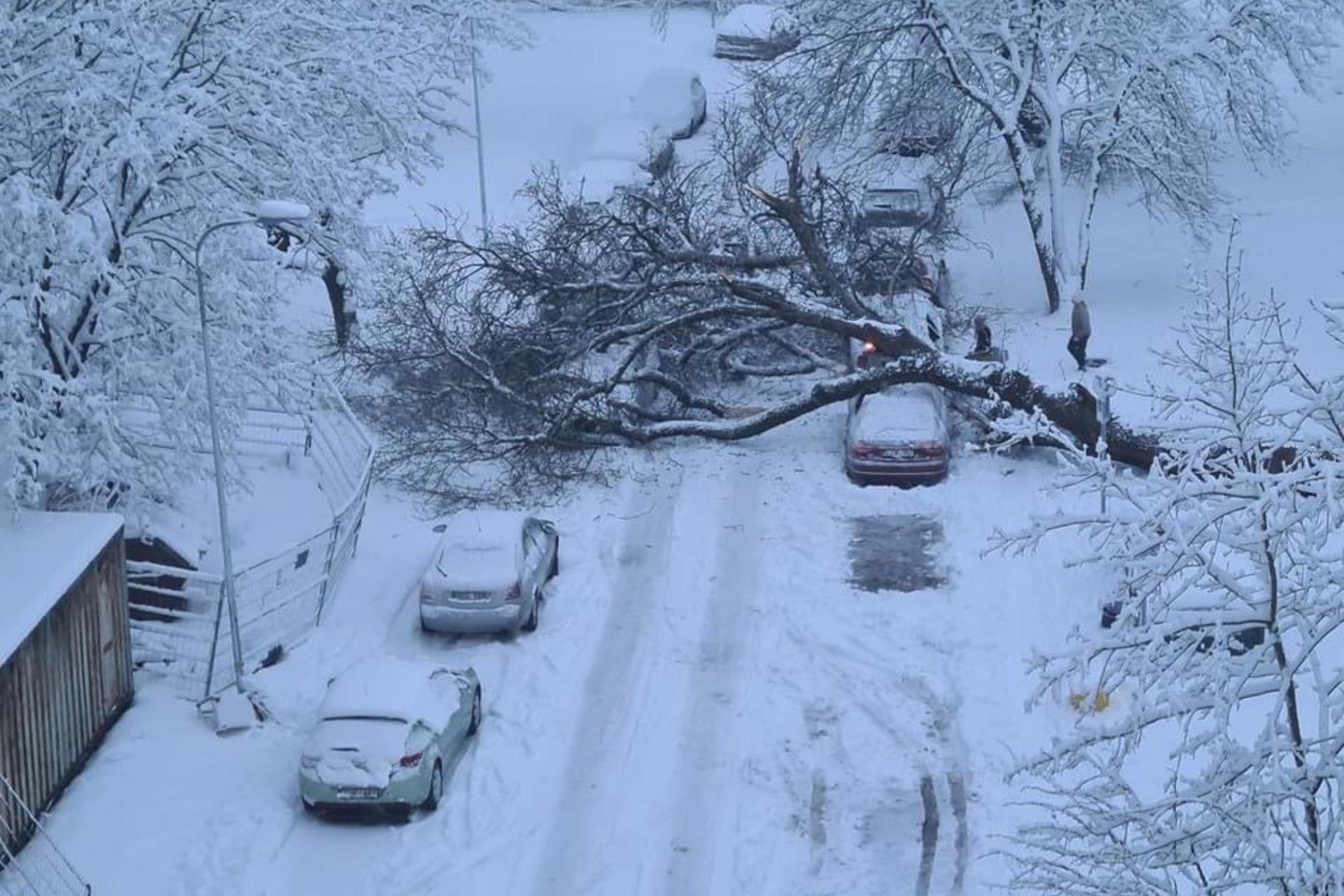 „Šiuo metu oro temperatūra yra apie nulį laipsnių, krenta šlapias, sunkus sniegas, tokio sniego nuo medžių šakų nenupučia vėjas, todėl jis kaupiasi ant medžių.