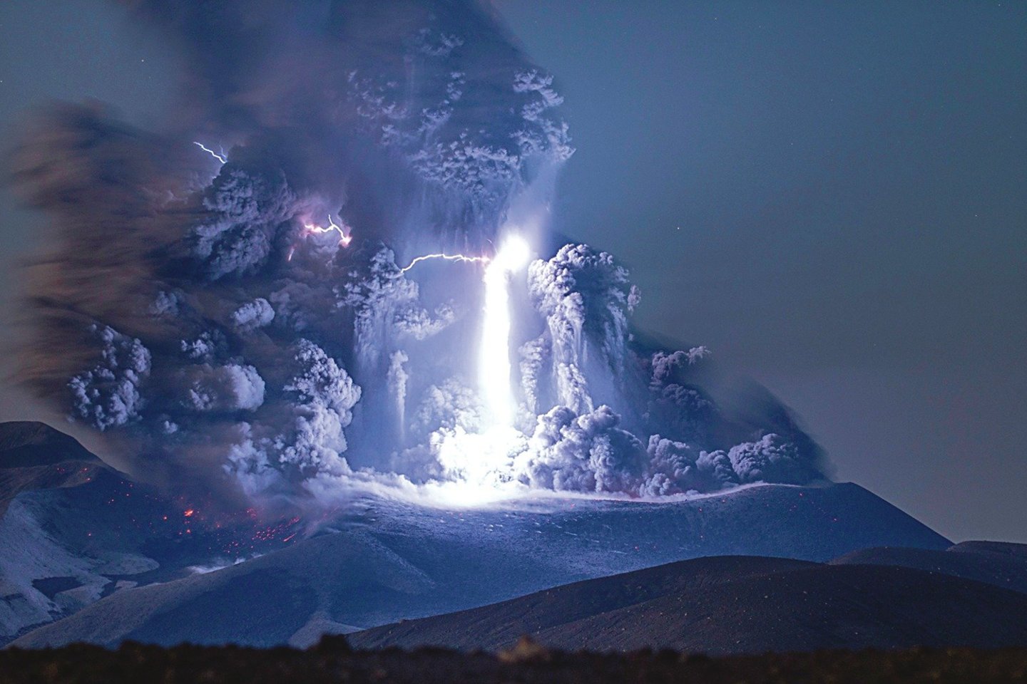 Vyras norėjo nufotografuoti ugnikalnio išsiveržimą, tačiau tuo pat metu į kraterį pataikė žaibas, sustingdęs pelenų debesį. Pasak fotografo, užfiksuoti tokią ryškią žaibo skleidžiamą šviesą pavyksta itin retai.