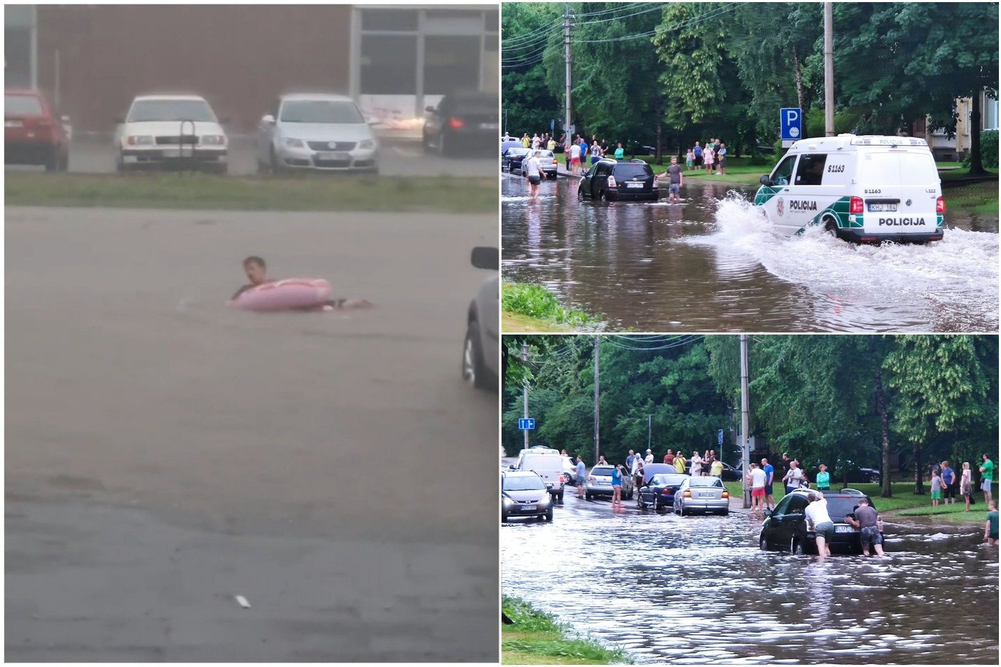 Užfiksavo, kas dėjosi Šiaulių gatvėse po liūties: plaukimo ratus griebę žmonės pasileido maudytis