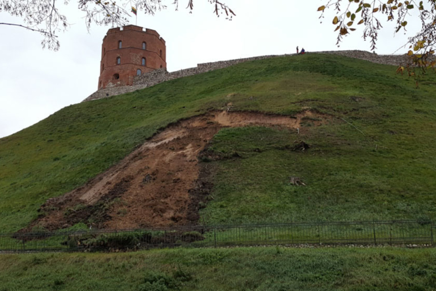 „Savaitgalį ant Gedimino kalno įvyko dvi nedidelės paviršinės nuošliaužos. Penktadienį pietvakariniame šlaite įvyko paviršinė nuošliauža. Pasekmės buvo operatyviai pašalintos, šlaitas nuplaniruotas. Vakar rytiniame šlaite jau anksčiau susiformavusi nuošliauža pasislinko žemyn ir atsirėmė į specialiai suformuotą grunto atramą. Visos nuošliaužos yra paviršinės, kalno pagrindiniai sluoksniai nėra pažeisti. Juda tik technogeninis daugiau nei prieš 15 metų supiltas sluoksnis“, – BNS pirmadienį teigė kultūros ministrės patarėjas Viktoras Bachmetjevas.