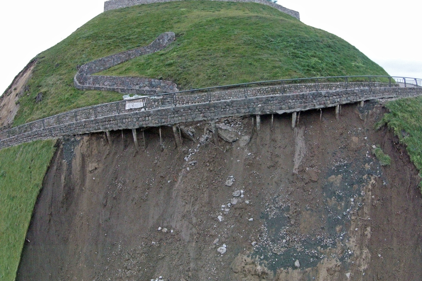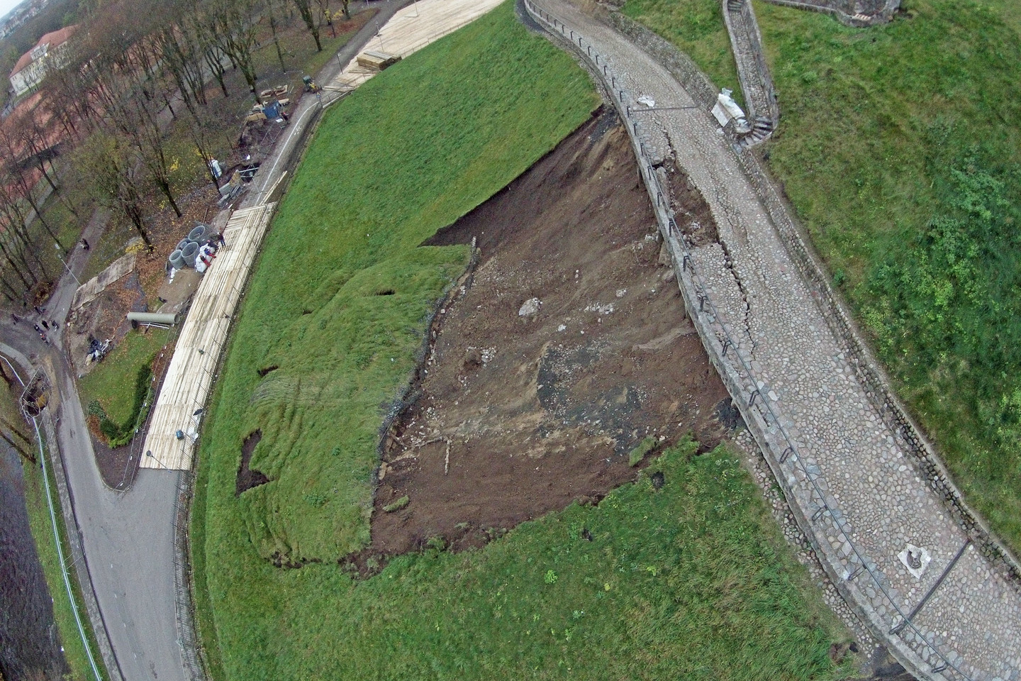 Naujausia didelė nuošliauža rytiniame Gedimino kalno šlaite susiformavo šeštadienio rytą. Nuslinkus velėnai, atsidengė pagrindinio tako poliai, o dalis jo įgriuvo.