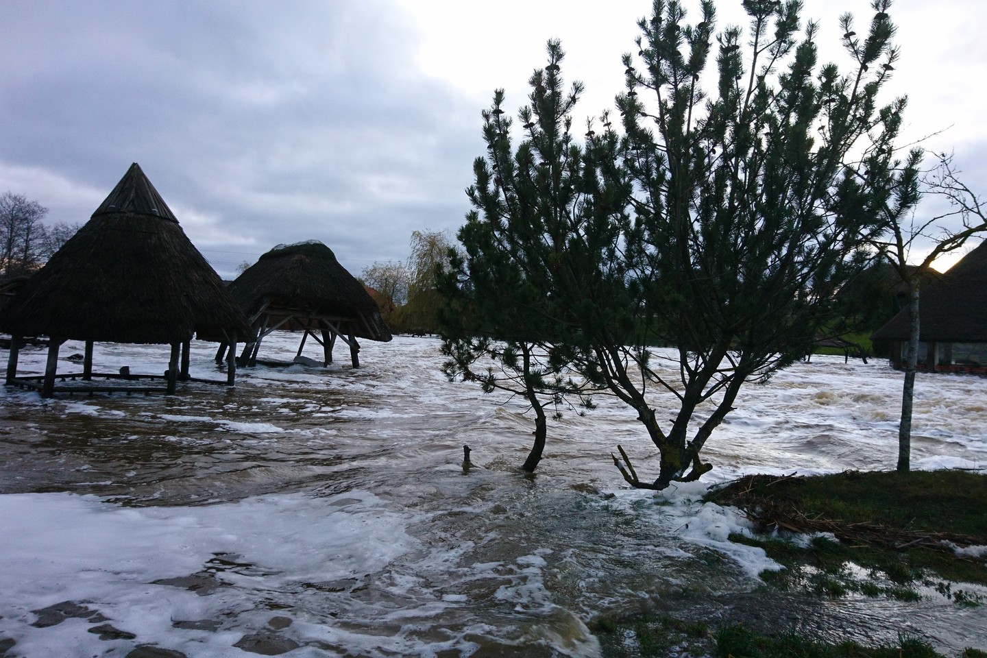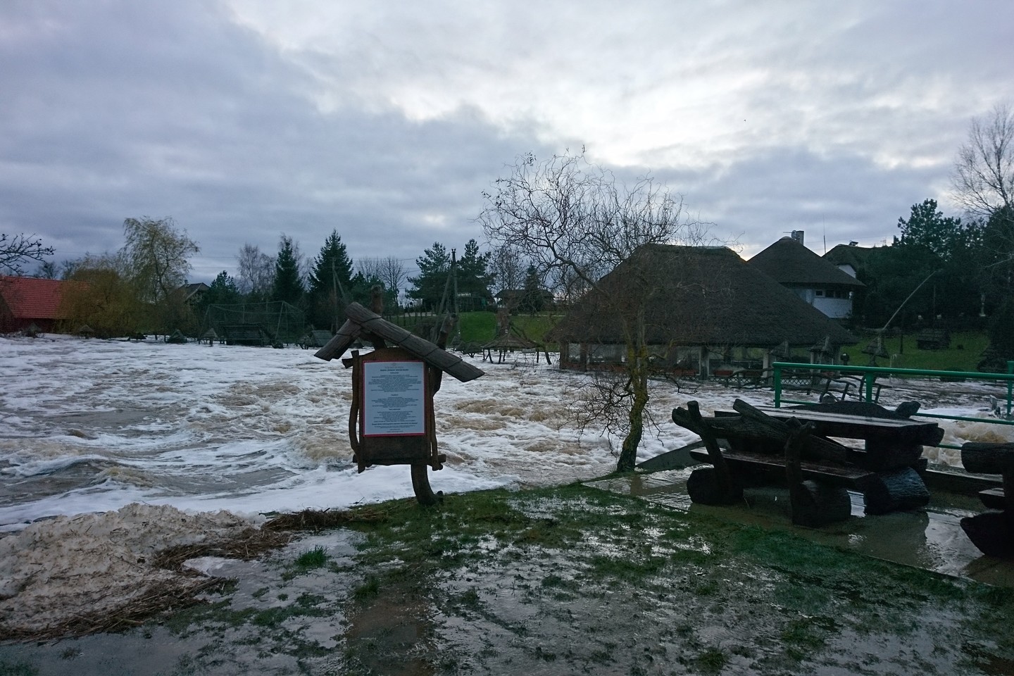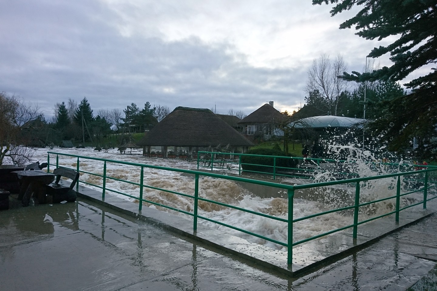Upės vanduo tvindo ir šalia esančias įrengtas poilsiavietes su stogeliais.