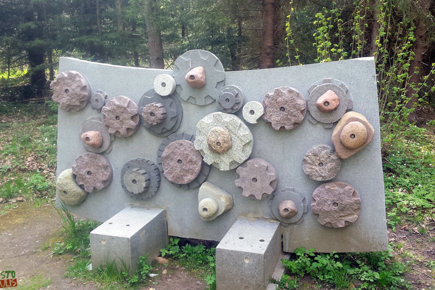 Tirpstant ledynams atsirado plyšiai, į kuriuos sukritusi morena buvo veikiama galingų vandens srautų. Šie srautai išplovė ir nusodino žemyn smulkesnę frakciją, viršuje palikdami tik stambesnius riedulius. Įdomiausia pažintinio tako dalis – skulptūrinės kompozicijos ir instaliacijos. Garsūs skulptoriai čia improvizavo akmenų tema. Akmenų rūžos pažintiniame take matome Kęstučio Musteikio akmenis su ženklais, Kazio Venclovo skulptūrą „Svarelis“, Jono Gencevičiaus kompoziciją „Žemės daiktai“, Gintaro Mikolaičio „Mechanizmus“ ir kitas skulptūras.