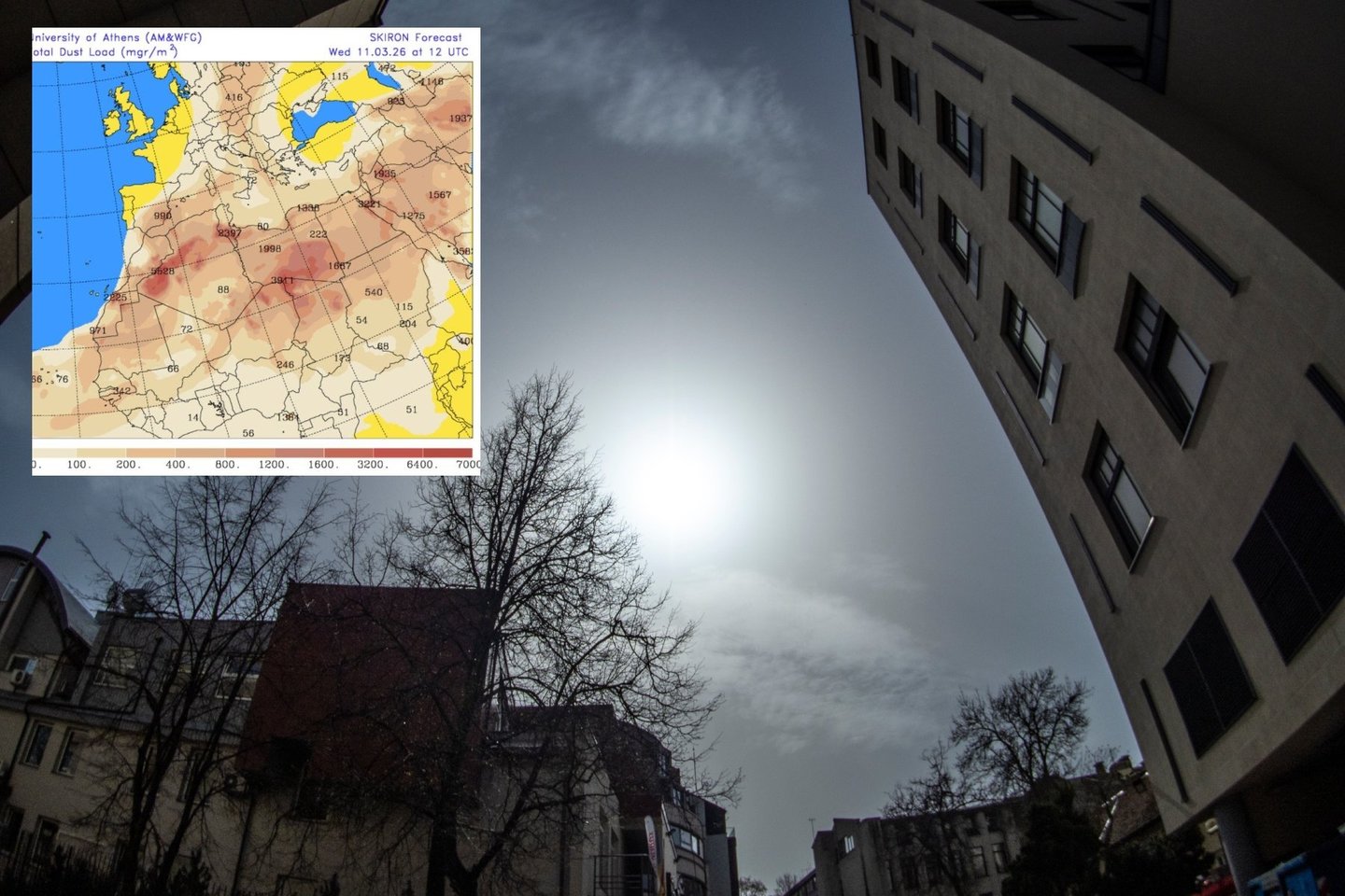 „Su šilto oro srautu iš pietvakarių atkeliavo ir Sacharos dykumos dulkės (nuo pat šiaurės vakarinės Afrikos dalies). Atkreipkite dėmesį į dangų, kuris šiandien atrodo labai balkšvas (žydra spalva aiškiau matyti tik žiūrint tiesiai virš galvos).