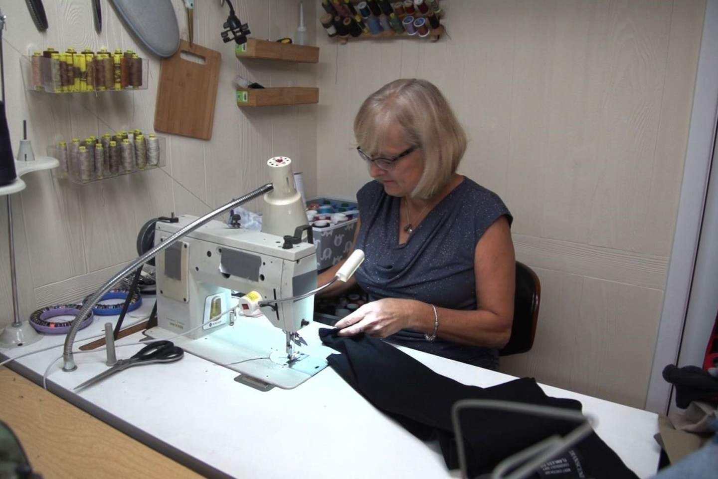 Savo privačią siuvyklą moteris įsirengė buto, kuriame gyvena, rūsyje. Vos tik gauna užsakymų, nusileidžia ir sėda dirbti. O sutvarkiusi kalnus džinsų prisėda kurti suknelių privačioms klientėms, kurių nuolat daugėja.